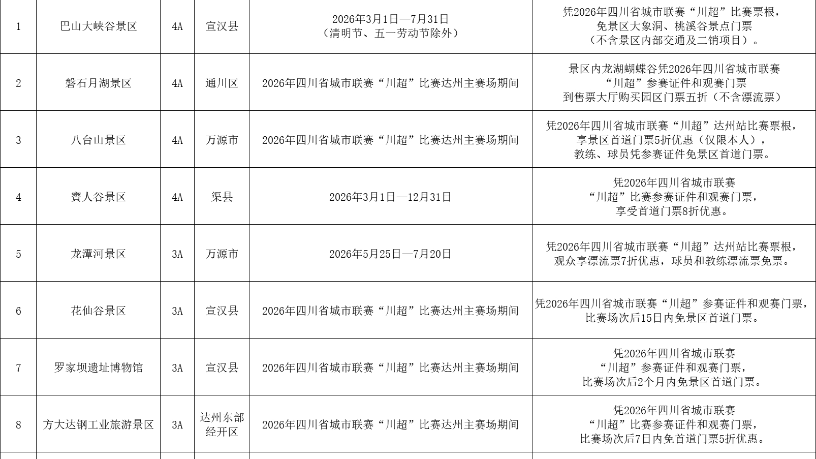 2025—2026赛季四川省城市足球联赛总决赛将于3月13日晚重启。达州市部分景区和民宿推出门票打折、免票及住宿优惠,如巴山大峡谷凭票根免大象洞、桃溪谷门票等。绵阳全市所有A级收费景区面向川超赛事人员和现场观赛球迷提供免门票优惠。【详细】