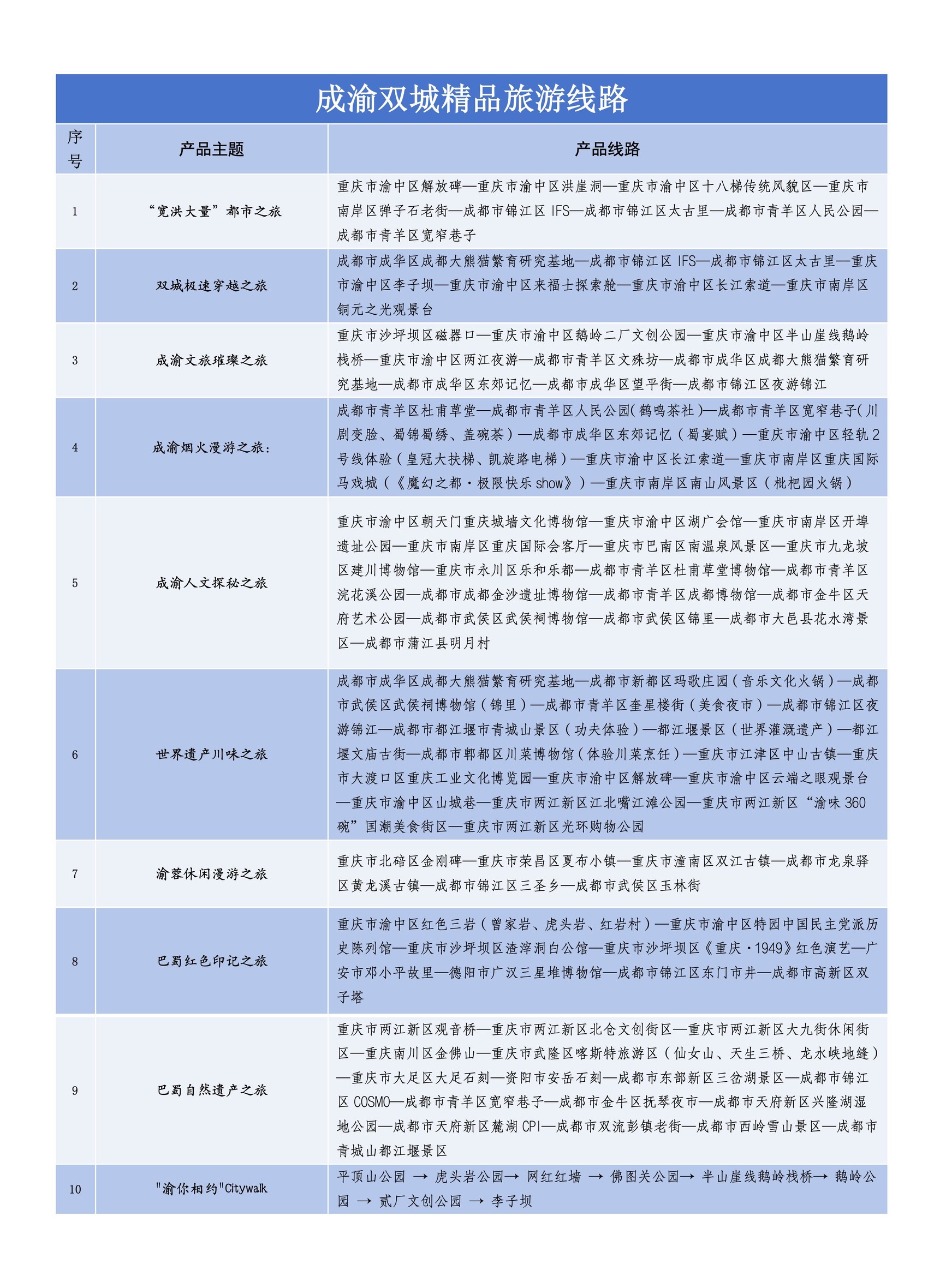 本次发布的“巴蜀走廊·成渝同行”成渝双城旅游精品线路有10条,包括“宽洪大量”都市之旅、双城极速穿越之旅、成渝文旅璀璨之旅、成渝烟火漫游之旅、成渝人文探秘之旅、世界遗产川味之旅、渝蓉休闲漫游之旅、巴蜀红色印记之旅、巴蜀自然遗产之旅、“渝你相约”Citywalk等,覆盖国内外游客多元旅游需求。这些线路串联川渝两地解放碑、太古里等核心商圈,杜甫草堂、洪崖洞等代表性文旅地标,也连接了城市新兴打卡点。