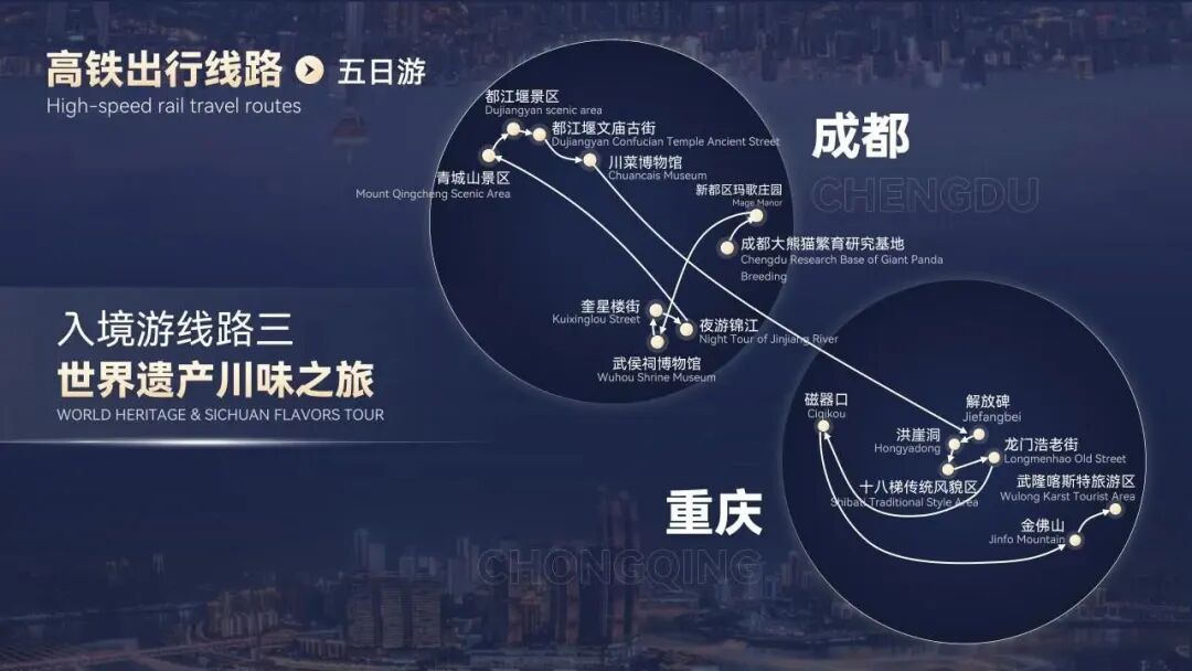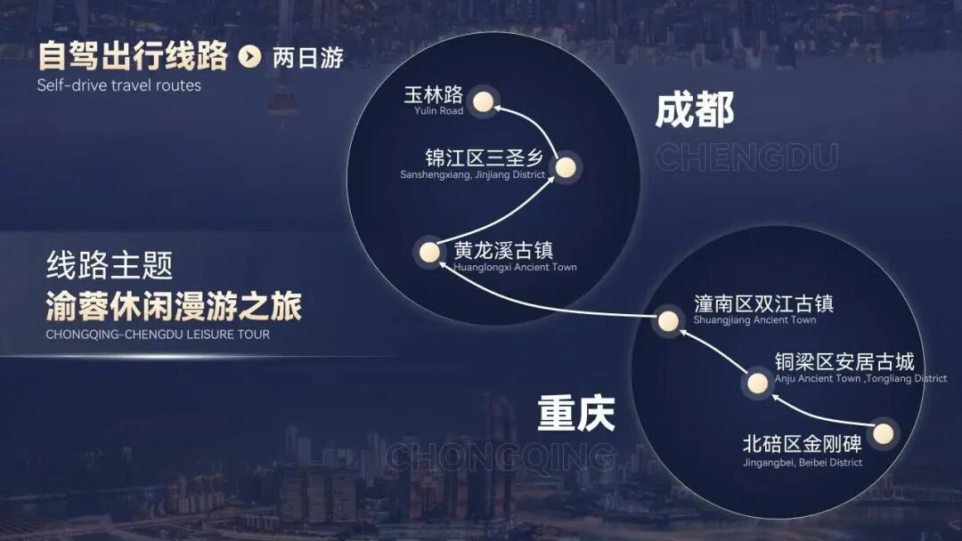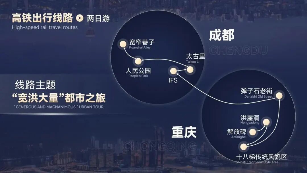 线路:重庆市渝中区解放碑—重庆市渝中区洪崖洞—重庆市渝中区十八梯传统风貌区—重庆市南岸区弹子石老街—成都市锦江区IFS—成都市锦江区太古里—成都市青羊区人民公园—成都市青羊区宽窄巷子