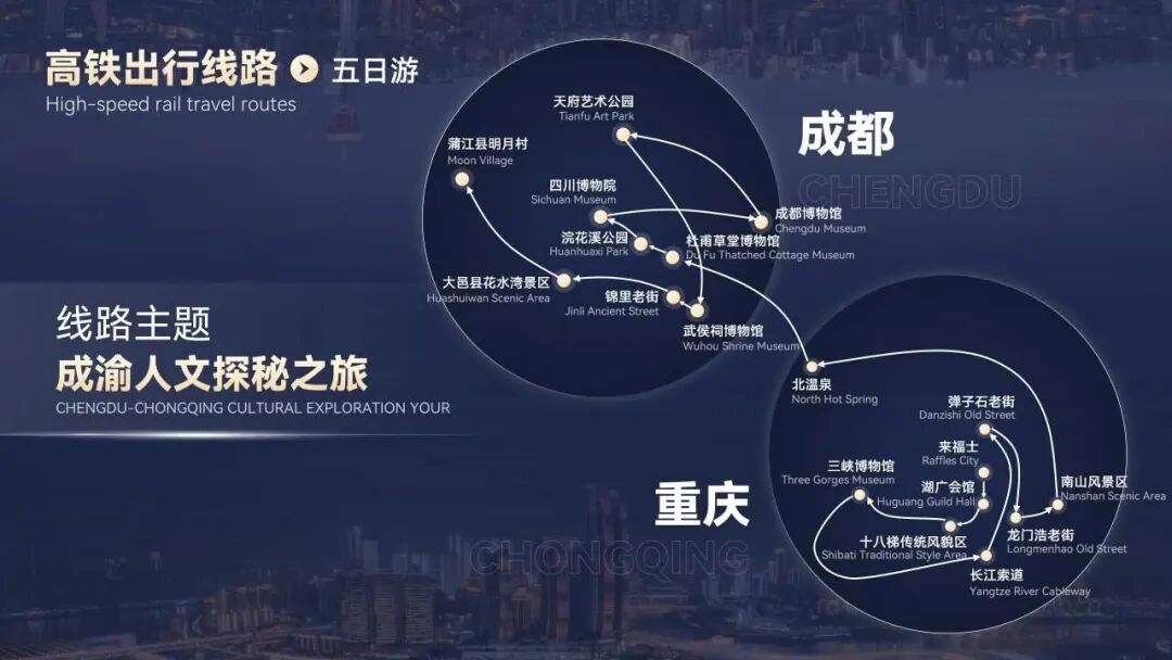 线路:重庆市沙坪坝区磁器口—重庆市沙坪坝区1949大剧院—重庆市渝中区鹅岭二厂文创公园—重庆市渝中区两江夜游—成都市青羊区文殊坊—成都市成华区成都大熊猫繁育研究基地—成都市成华区东郊记忆—成都市成华区望平街—成都市锦江区夜游锦江