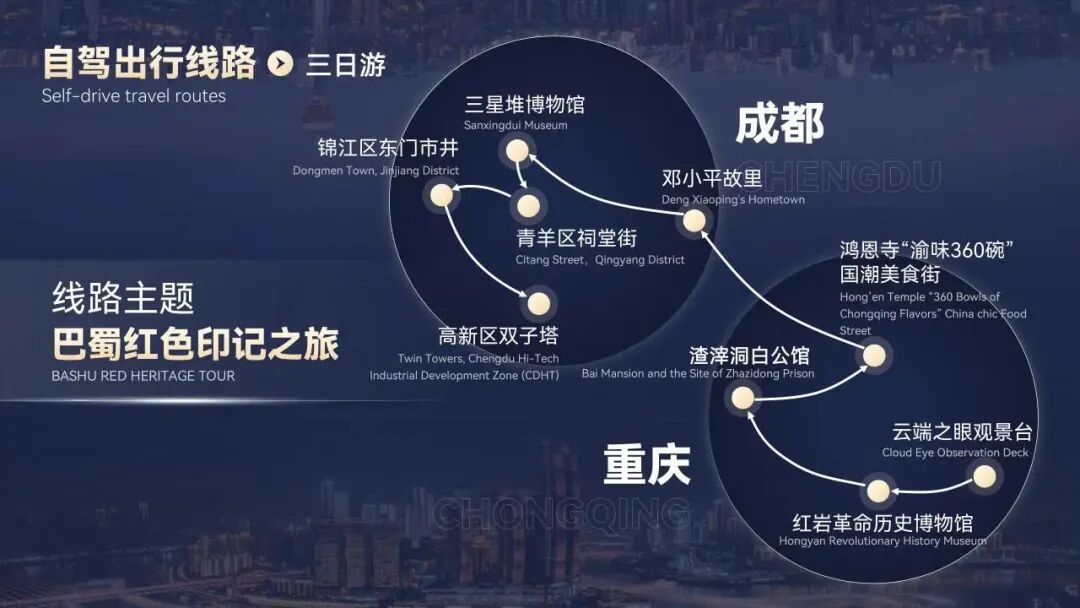 线路:重庆市渝中区云端之眼观景台—重庆市渝中区红岩革命历史博物馆—重庆市沙坪坝区渣滓洞白公馆—重庆市两江新区鸿恩寺“渝味360碗”国潮美食街—广安市邓小平故里—德阳市广汉三星堆博物馆—成都市青羊区祠堂街—成都市锦江区东门市井—成都市高新区双子塔