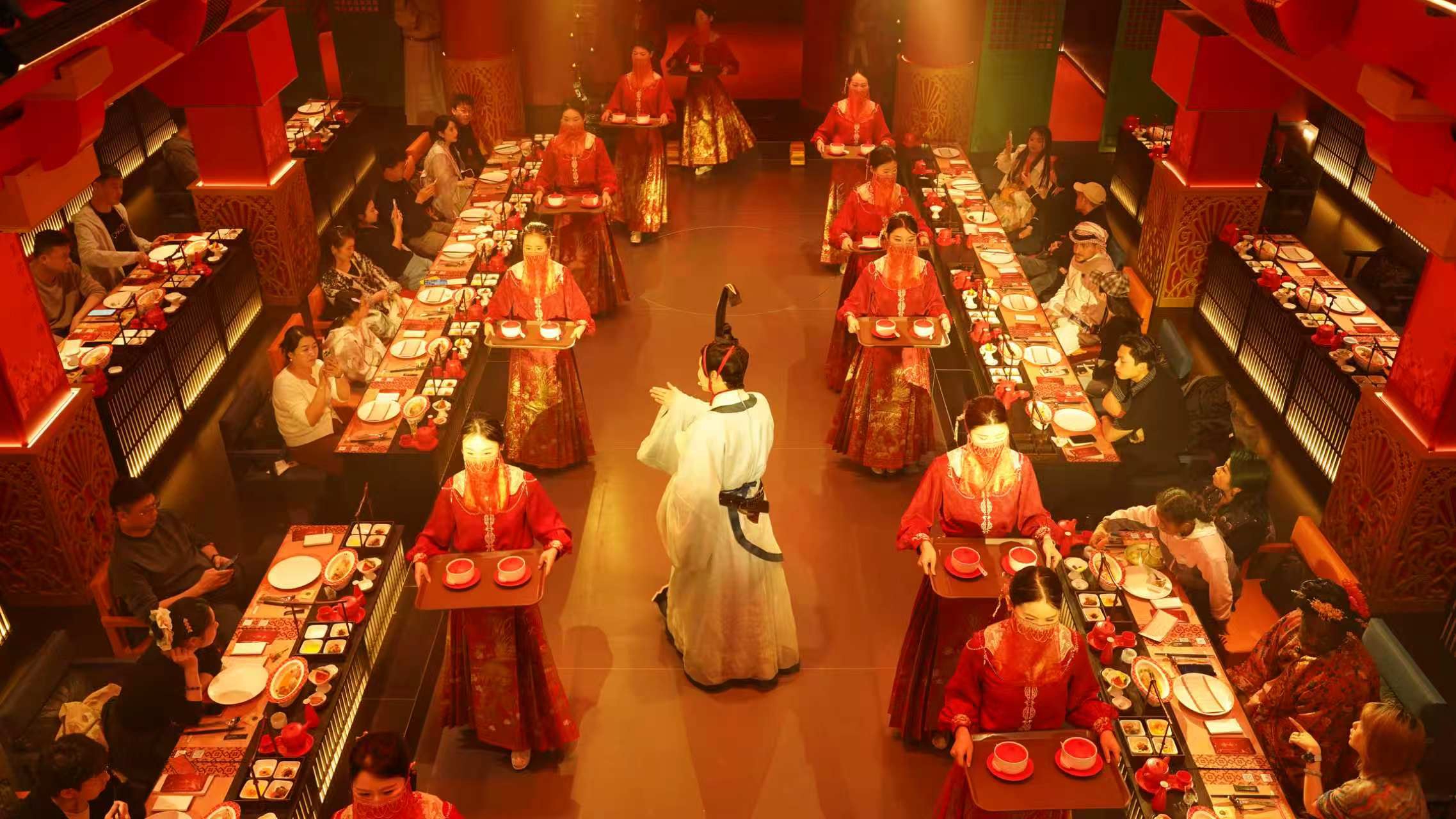 成都“锦秀餐秀”沉浸式演出融合三星堆、三国、三苏、老成都烟火气等元素。