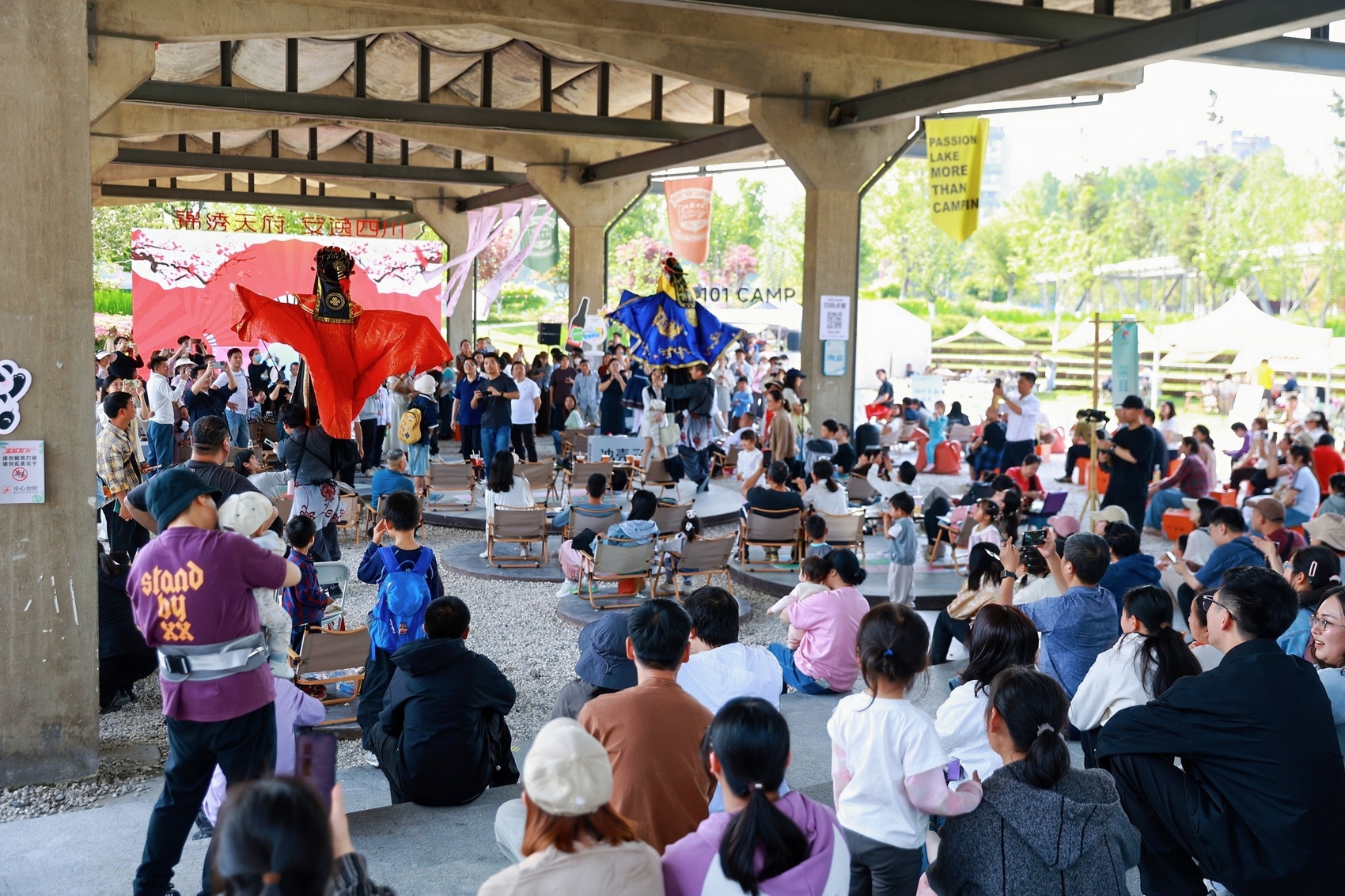 4月19日,活动首站在杭州小河公园展开。现场浓郁巴蜀风情扑面而来:四川非遗展示体验、文创产品展销等区域亮点纷呈,“花局”熊猫玩偶、自贡剪纸灯、三星堆文创、蜀锦摆件等特色好物集中亮相。