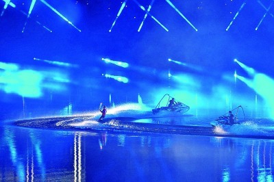 中国滑水运动员以滑水的方式疾驰于秦皇湖上,共同点燃主火炬。本报记者 陈城摄/光明图片