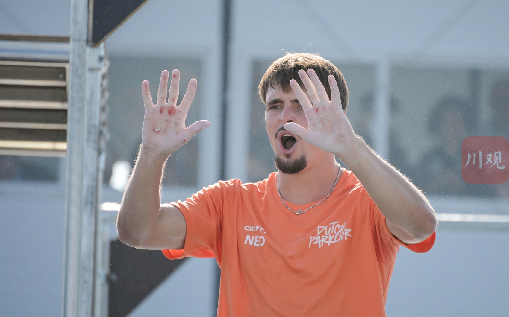 当日举行的赛事为男子自由式跑酷决赛。中国选手首个出场。作为以最低分进入决赛的选手,富思达在决赛铆足干劲博“翻盘”,选取了相对预赛中更加困难的动作,甚至出现了“爆茧”(手部的老茧被磨破)的情况。荷兰选手选取的高难度动作同样导致赛后出现双手“爆茧”,为他赢得了仅次于日本和法国队的难度得分。