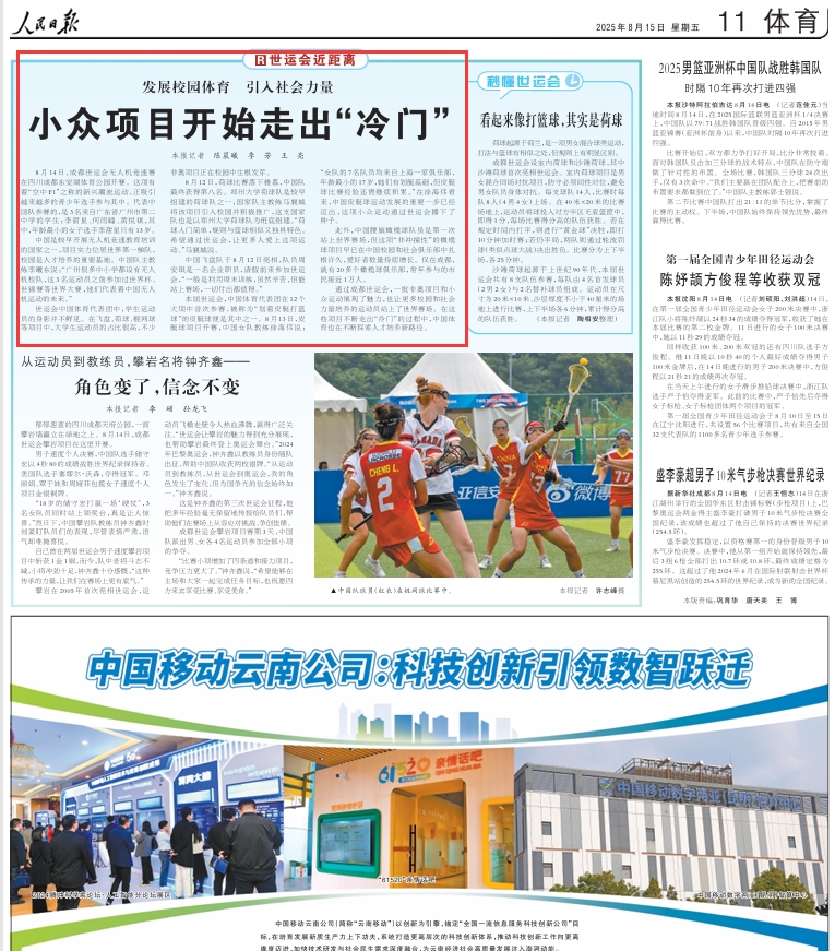 通过成都世运会,一批非奥项目和小众运动展现了魅力,也让更多校园和社会力量培养的运动员站上了世界赛场。在这些项目不断走出“冷门”的过程中,中国体育也在不断探索人才培养新路径。