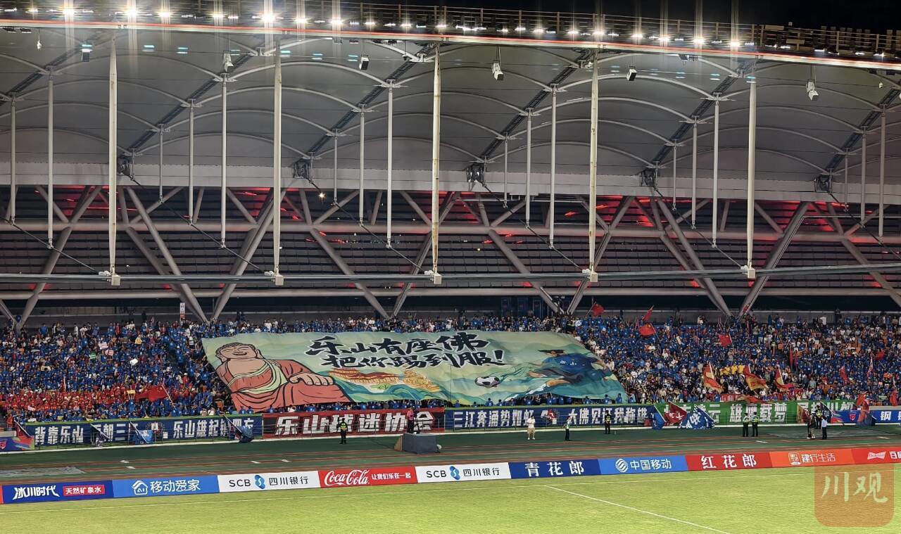 19点35分,川超联赛乐山主场与攀枝花队的对决一触即发。开赛前,乐山球迷看台区突然展开一幅巨型Tifo,图案与谐音梗设计逗乐了全场球迷,也点燃了乐山奥体中心。