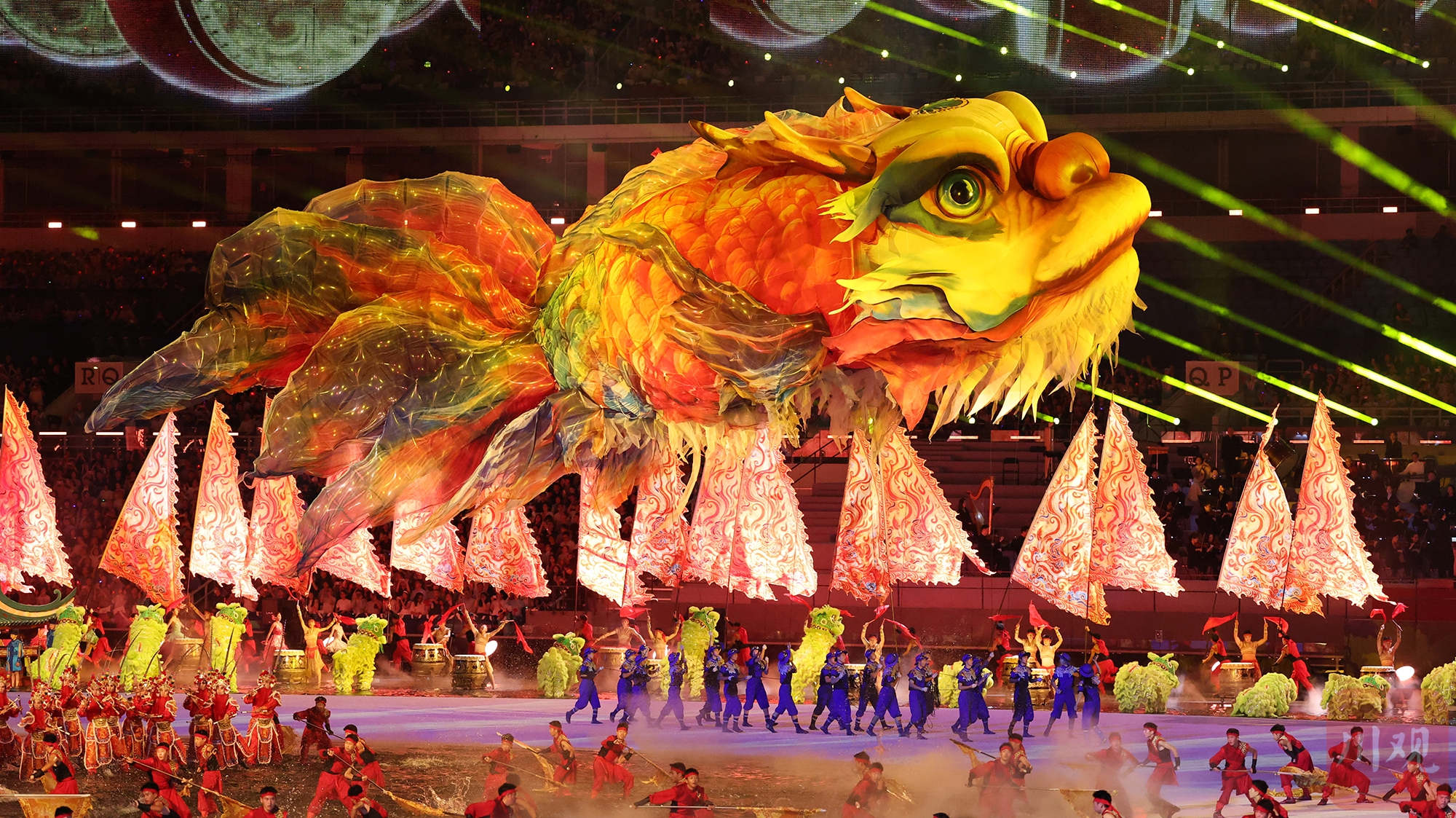 本届全运会开幕式文体展演阵容汇聚内地、香港、澳门三地文艺力量,通过“同根同源、同心同缘、同梦同圆”三大篇章,将岭南醒狮、粤剧水袖、龙舟竞渡、英歌舞等传统文化元素,与人工智能、VR、机器人等前沿科技深度融合,打造出一场“古今对话”的沉浸式艺术盛宴。