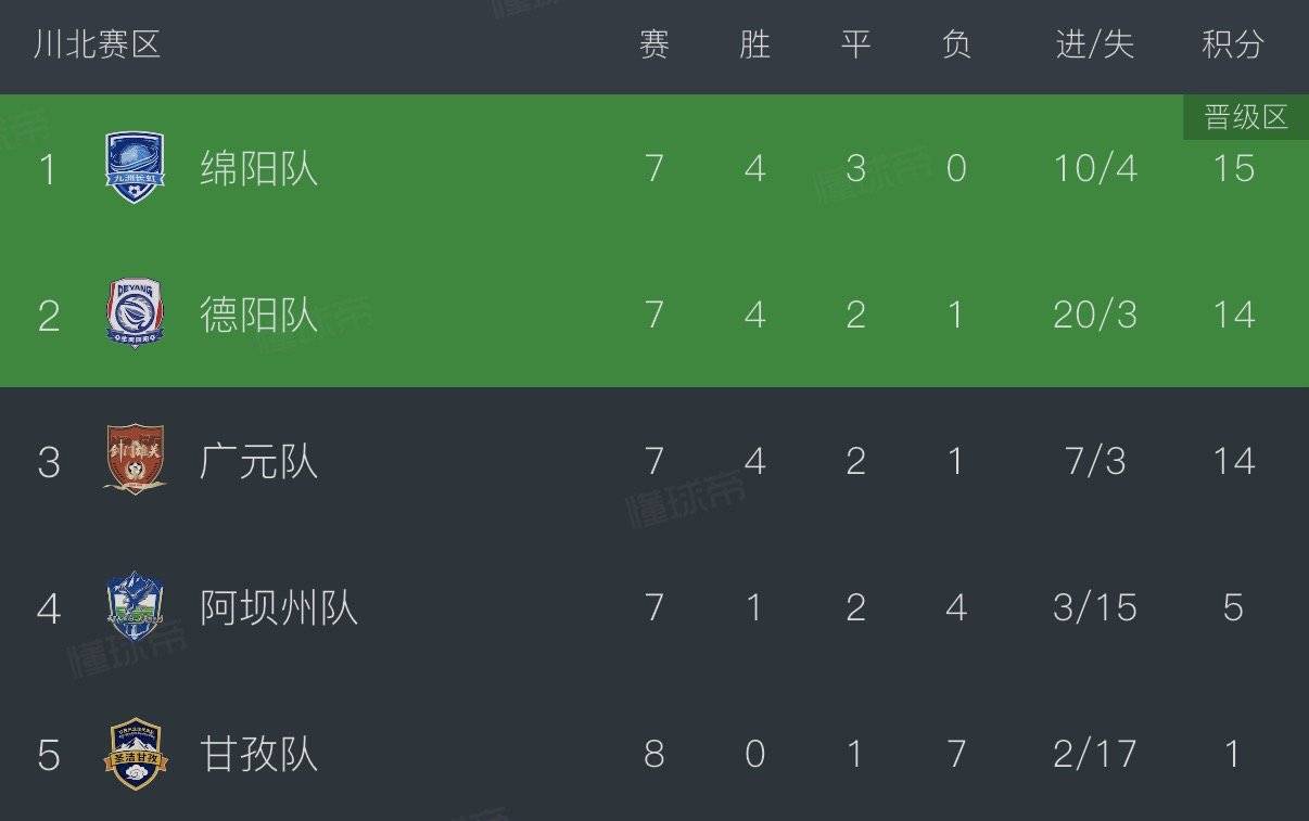 本轮川北赛区比赛中,德阳队以5:0大胜阿坝队,易宇翀梅开二度,成为球队取胜的关键人物;广元队则以2:0击败甘孜队。两队目前同积14分,由于绵阳队已提前锁定一个出线名额,德阳与广元将争夺该赛区最后一个晋级资格。
