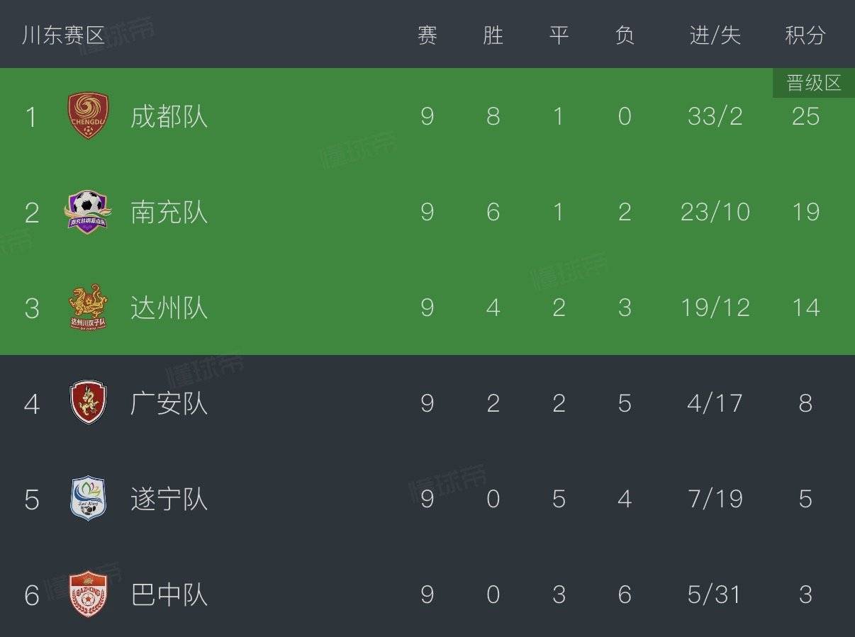 其他赛区第九轮同样战况激烈:川东赛区方面,成都锦城队3:0完胜广安队,以8胜1平的不败战绩稳居榜首;达州队5:0大胜巴中队,谢紫靖上演帽子戏法,帮助球队锁定出线资格。川西赛区则上演进球大战,凉山队与乐山队3:3战平,两队均已提前晋级总决赛。