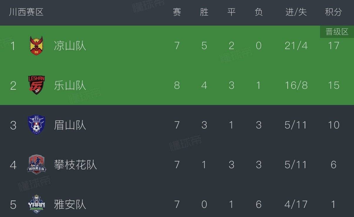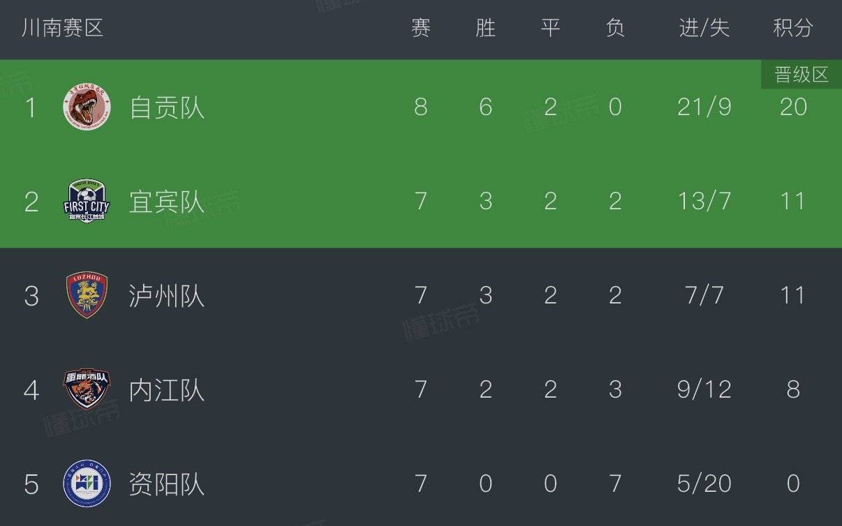 川南赛区的出线之争较复杂。本轮过后,宜宾和泸州同积11分,由于净胜球的原因,宜宾列前。泸州若想获得出线资格,需满足以下两种情况之一:一是泸州赢内江,同时宜宾踢平或负于资阳;二是泸州平内江,则宜宾必须负于资阳。宜宾则占据出线有利位置,下一轮对阵资阳,只要宜宾获胜,且泸州没有大比分战胜内江就可以出线。