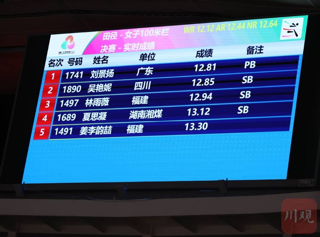 11月19日,第十五届全运会田径比赛迎来女子100米栏的决赛。曾参加奥运会、世锦赛的四川选手吴艳妮以12秒85的成绩拿到银牌,结束自己的第三次全运会之旅。广东选手刘景扬以12秒81的成绩获得冠军。