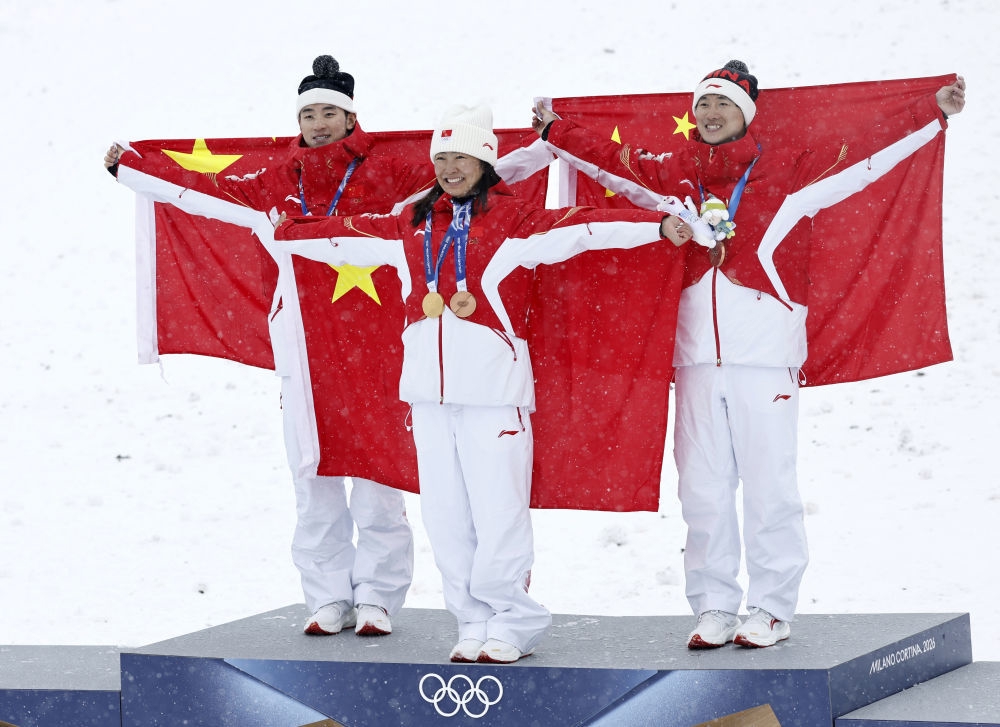 中国队选手李天马(左)、王心迪(右)和徐梦桃在颁奖仪式后身披五星红旗庆祝。图据新华社