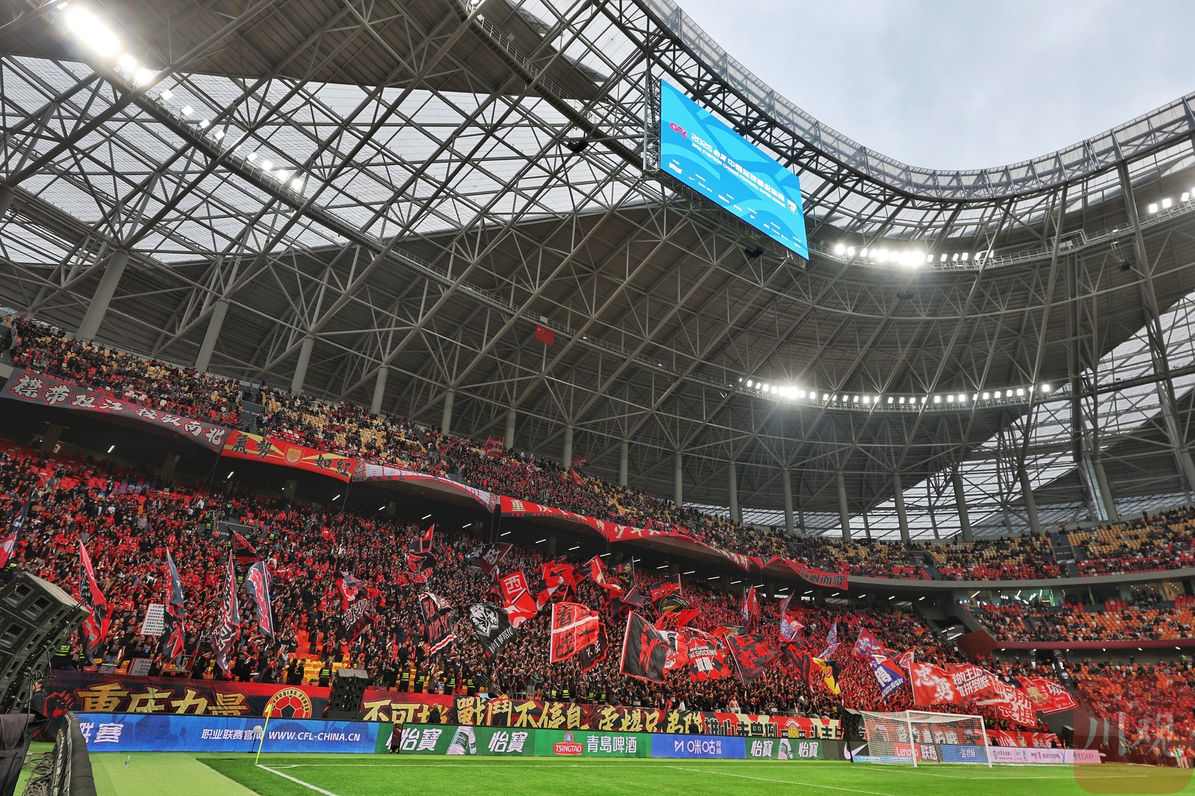 看台上,重庆球迷的巨型“龙”TIFO霸气十足,成都近4000名“远征军”则以红色海洋回应。比赛过程中,两队球迷的助威较量也从未停止。