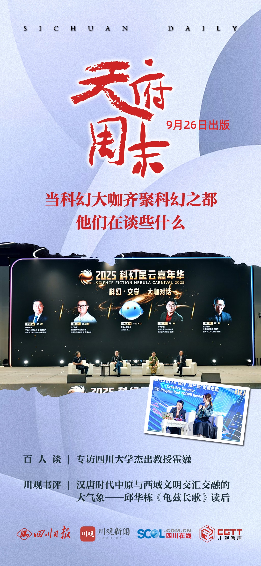 9月19日至21日,2025银河科幻大会与科幻星云嘉年华在成都同期举行。多场大咖对谈、专题交流与创意活动,让全球目光聚焦这座充满想象力的城市。两场大会以强大的嘉宾阵容、丰富的活动设置与深度的思想交流,再次彰显成都作为“中国科幻之都”的底气和吸引力。本期天府周末,我们特别聚焦与会嘉宾的精彩热议和观点碰撞,希望给读者一些启发。