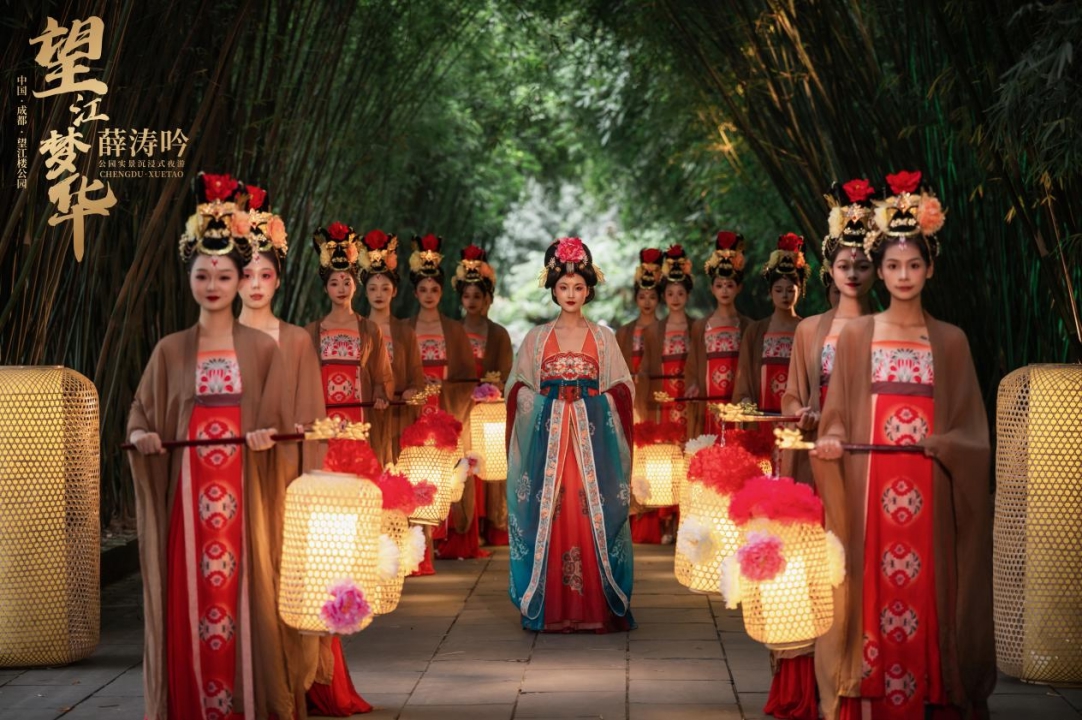 9月28日起,由成都中青旅联手望江楼公园打造的《望江梦华·薛涛吟》公园实景沉浸式夜游正式开演。跟随大唐女校书薛涛的步伐,依托望江楼公园的建筑和遗迹,融合实景演绎、情景舞蹈与互动体验,一步一景一故事,走进薛涛有才情又跌宕的一生,与大唐风华近距离对望。