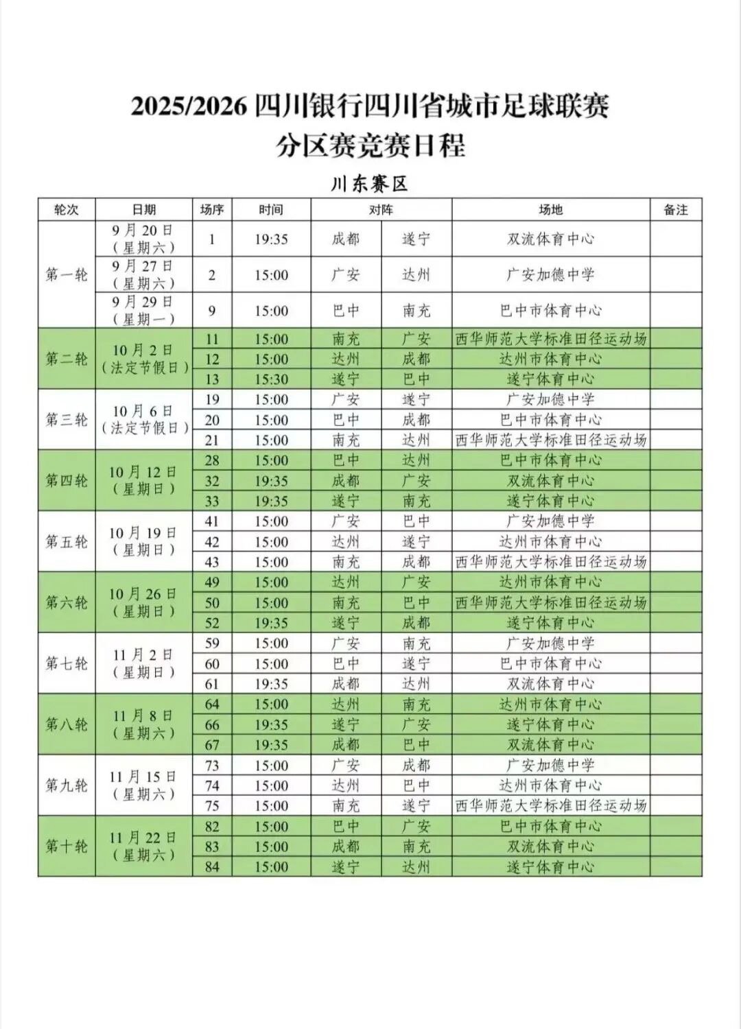 随着国庆中秋“双节”假期在10月1日拉开序幕,2025/2026四川省城市足球联赛(“川超”)也将在此期间展开两轮争夺,四个赛区6天时间一共将为广大球迷献上18场精彩对决。同时,全省21个市州还将针对“川超”赛事,配套文旅活动,邀请大家到四川看球赛、赏美景、品美食。