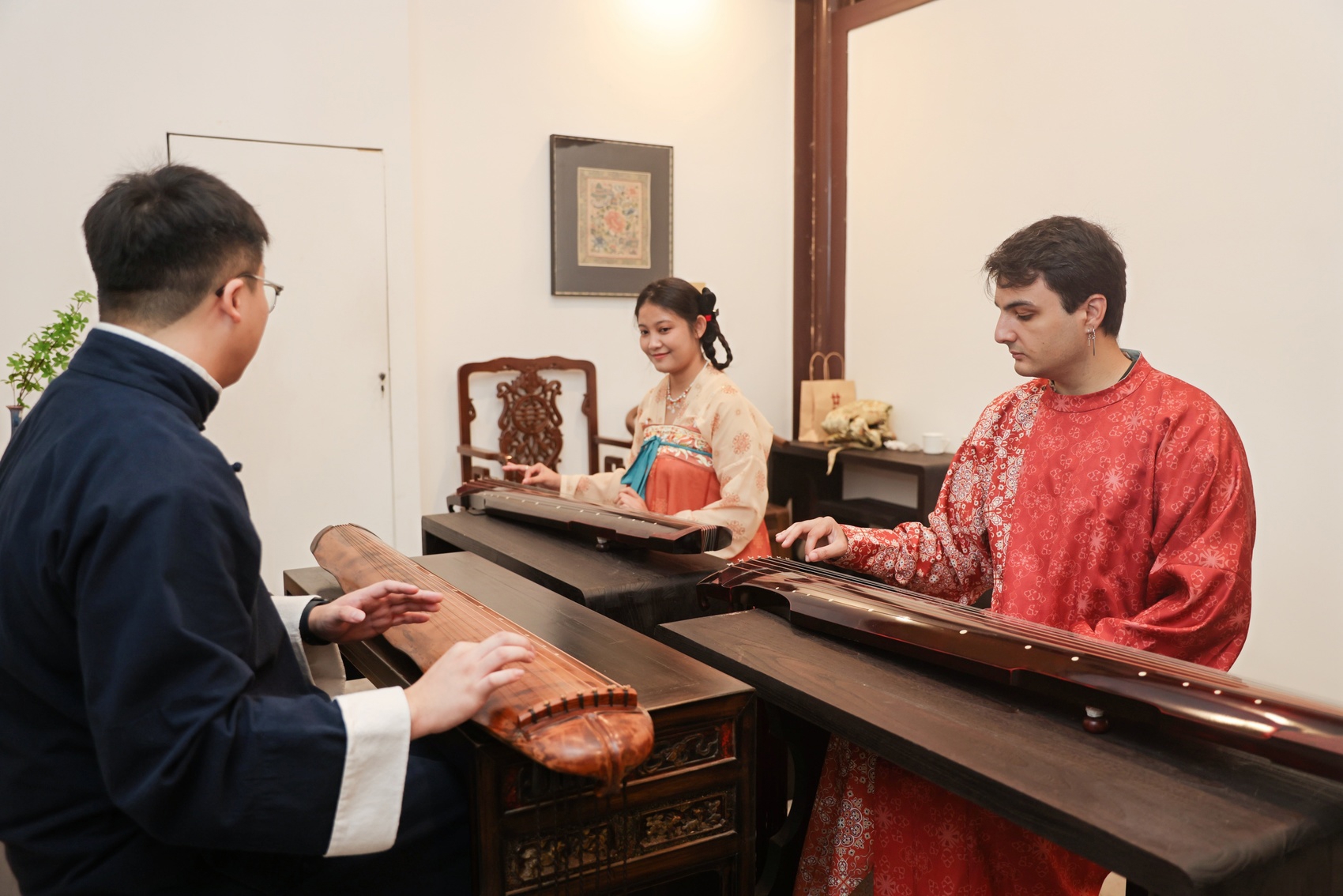 在成都杜甫草堂博物馆艺术中心,来自越南、泰国、俄罗斯等十余国的四十余名四川大学留学生齐聚“中秋听琴”雅集。《梅花三弄》《流水》等经典古琴曲泠然流淌,琴音时而舒缓如浣花溪水,时而清越若秋日流云。琴友围坐其间,任泠泠弦歌与袅袅茶烟浸润身心,体味古人“品茗抚琴”的古典雅意。