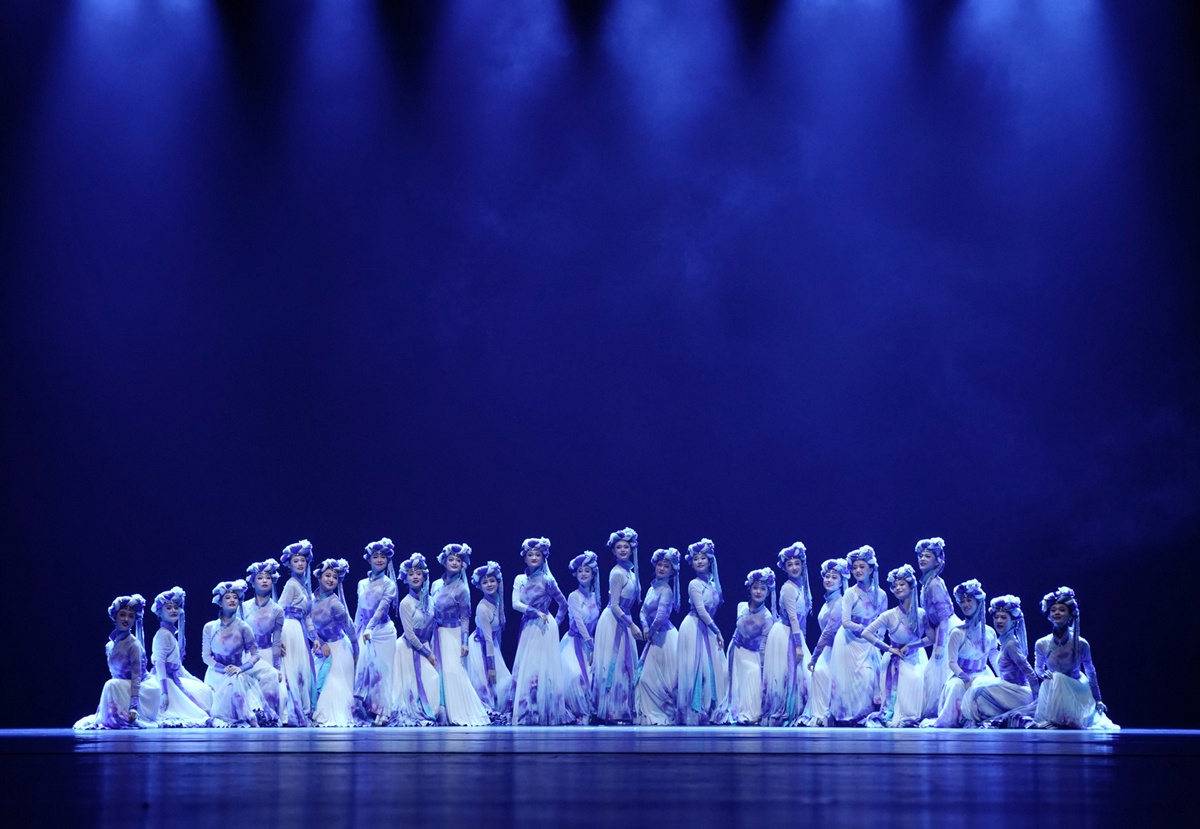 舞台上,二十余位舞者身着改良服饰缓缓起身,裙摆如流水般拂过地面,肢体语言似柳枝轻摇、似清泉漫溢。群舞整齐划一却不失灵动,情感传递层层递进,让现场观众沉浸其中。