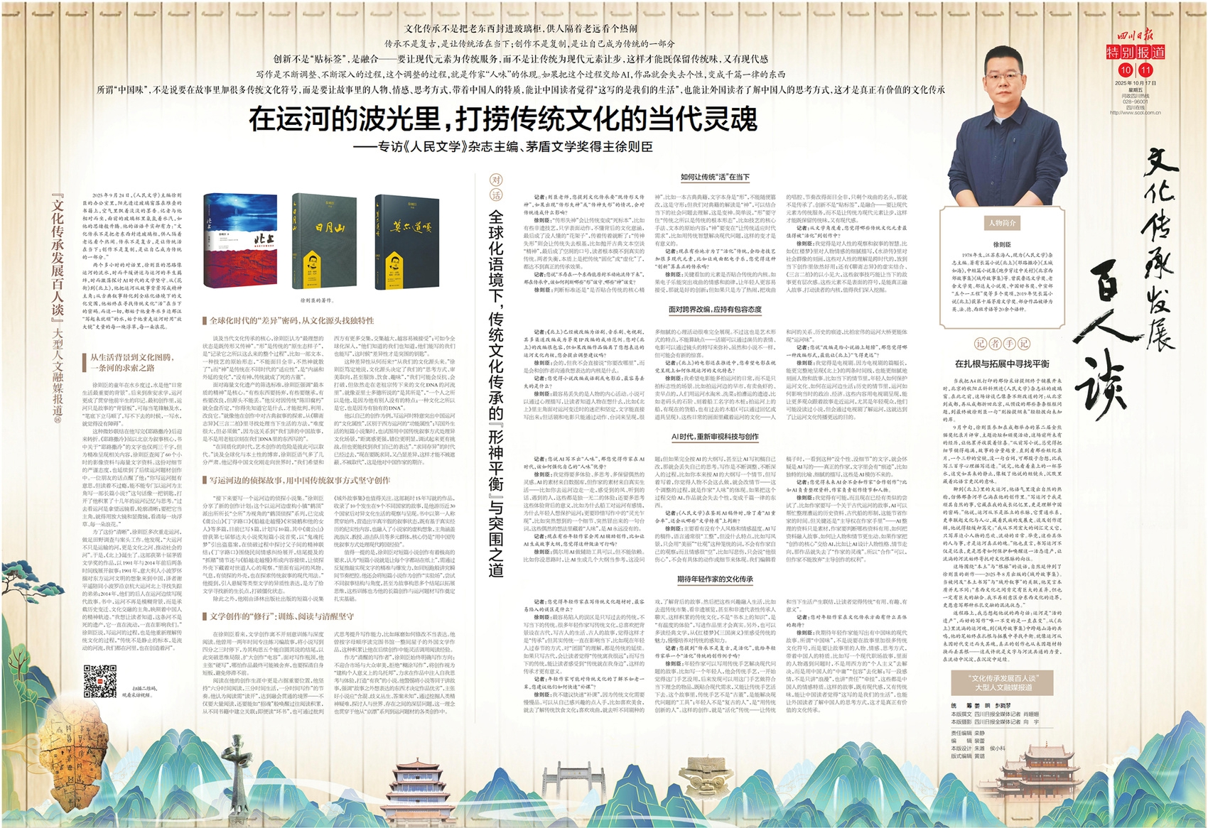 四川日报全媒体“文化传承发展百人谈”大型人文融媒报道持续推出,今日《四川日报》连版推出第九十八期,专访《人民文学》杂志主编、茅盾文学奖得主徐则臣。