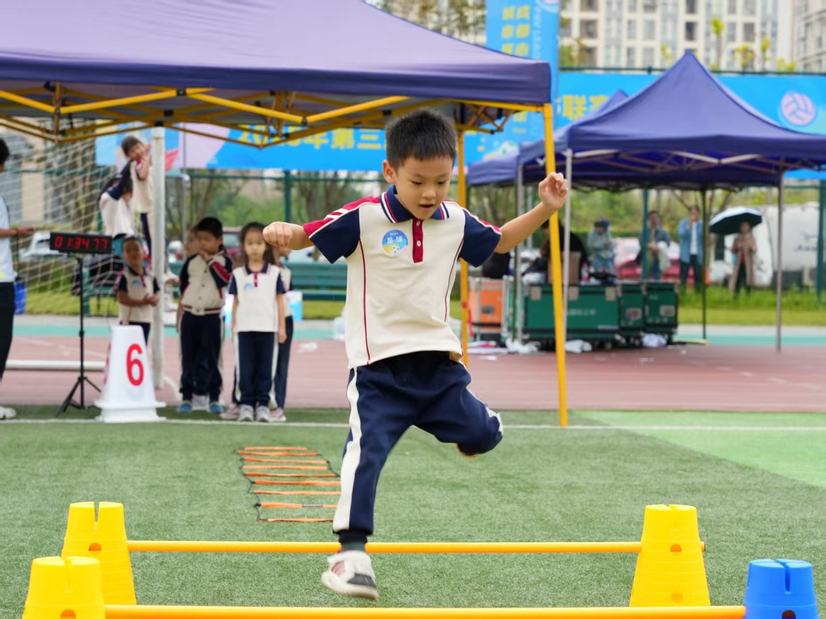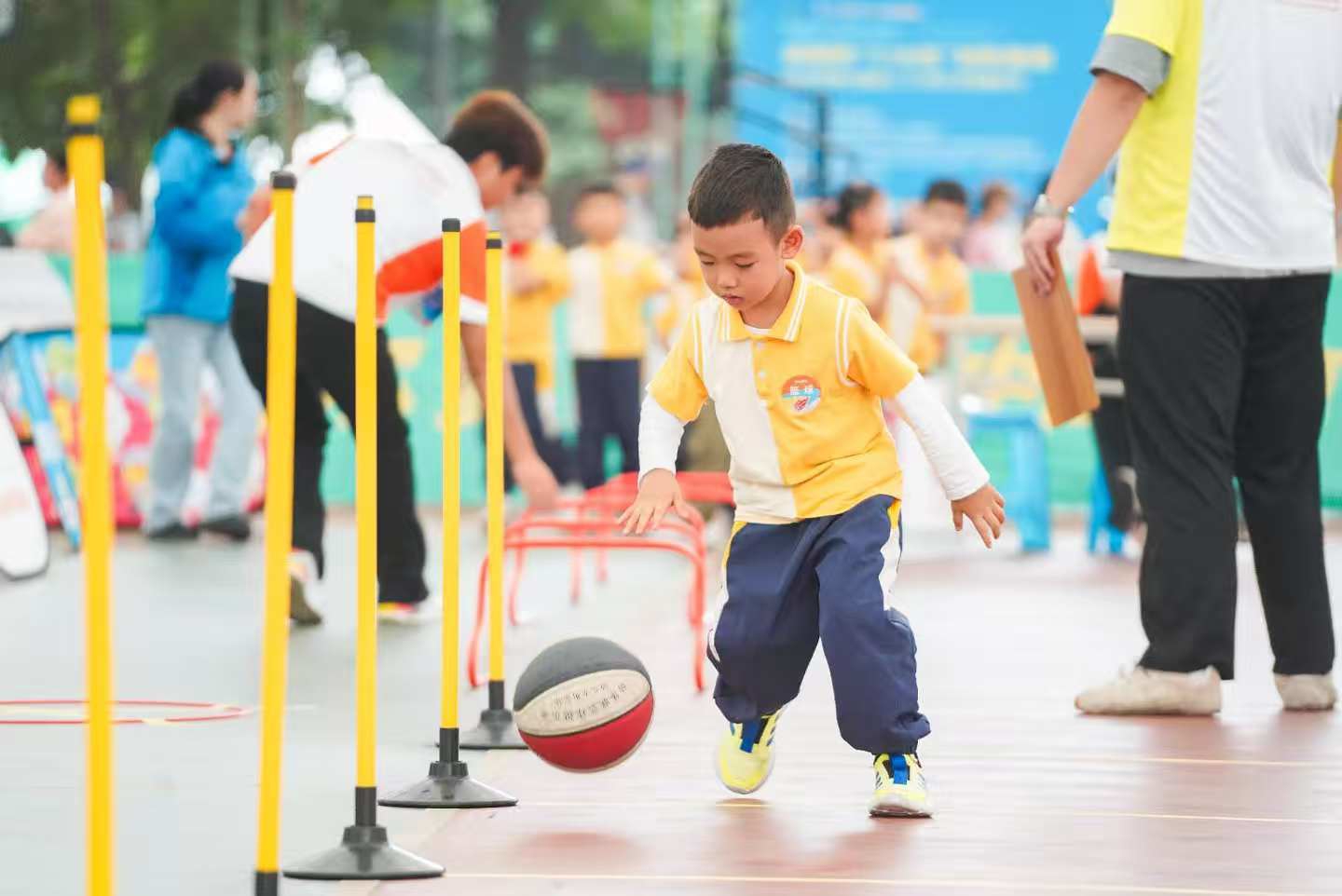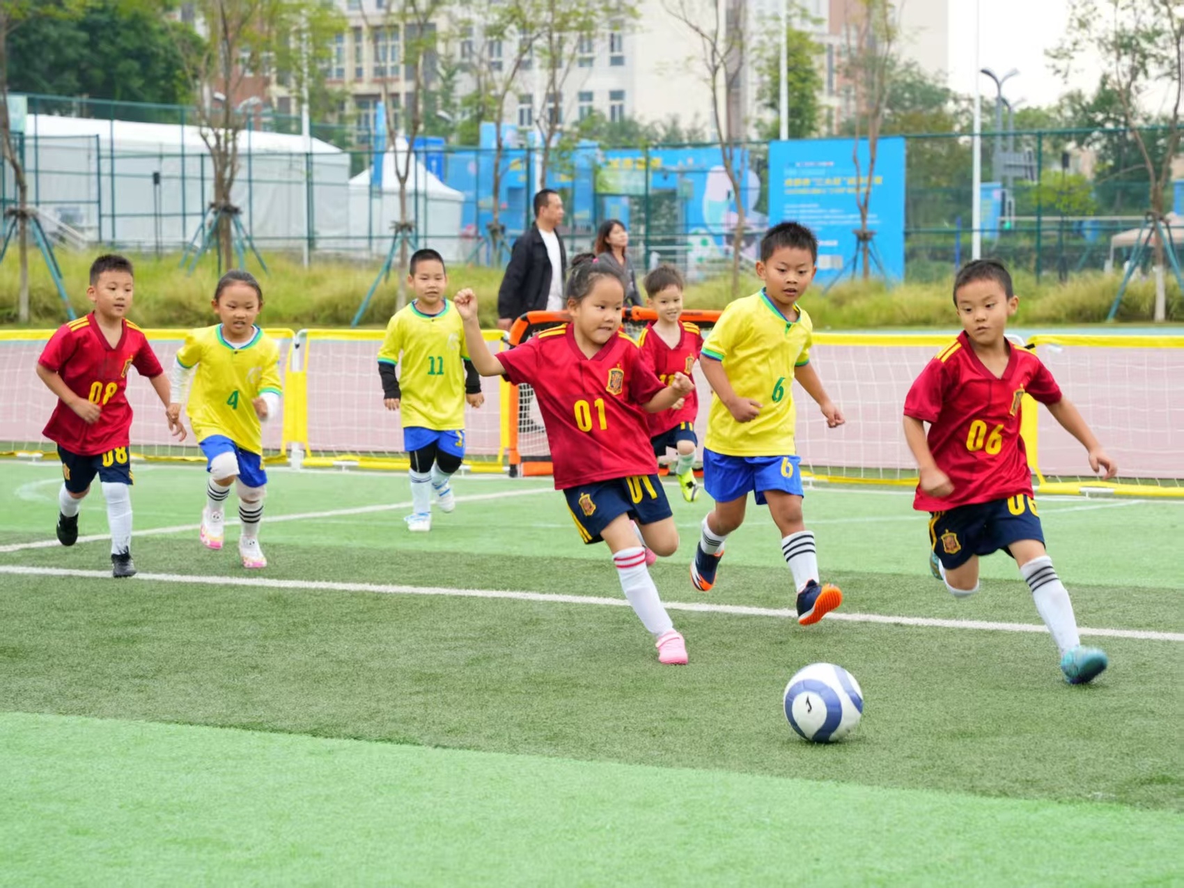 开幕式之后,足球5V5迷你赛、篮球3V3协作攻防、排球3V3闯关游戏和三大球趣味游戏等项目同步展开,小小运动员们在“彩虹通道”中带球穿梭,在“卡通篮筐”前投掷,在软式排球的传递中击掌欢呼……7100余名运动蓉娃将尽情享受运动的快乐。