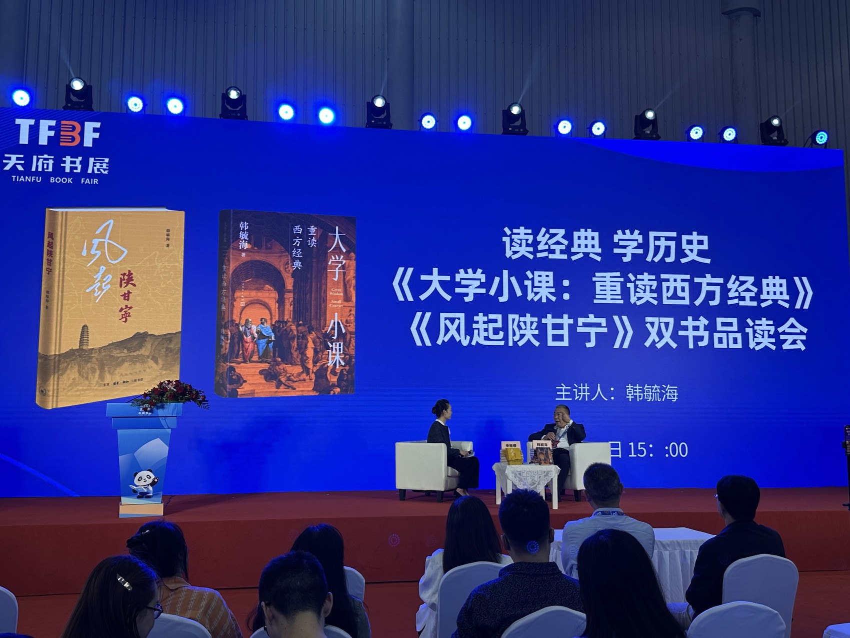 10月18日下午,2025天府书展主展场内一场以“读经典,学历史”为主题的双书品读会吸引了众多读者。北京大学教授韩毓海携其著作《大学小课:重读西方经典》与《风起陕甘宁》亮相,与读者一同探讨经典著作如何照进现实。