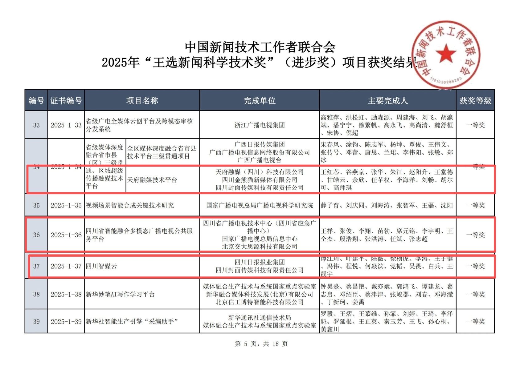 其中,来自四川日报报业集团的天府融媒技术平台、四川智媒云和支撑媒体集群的主流媒体智能传播平台分别荣获两项一等奖和一项二等奖。