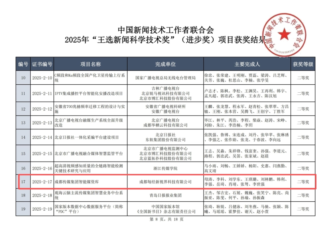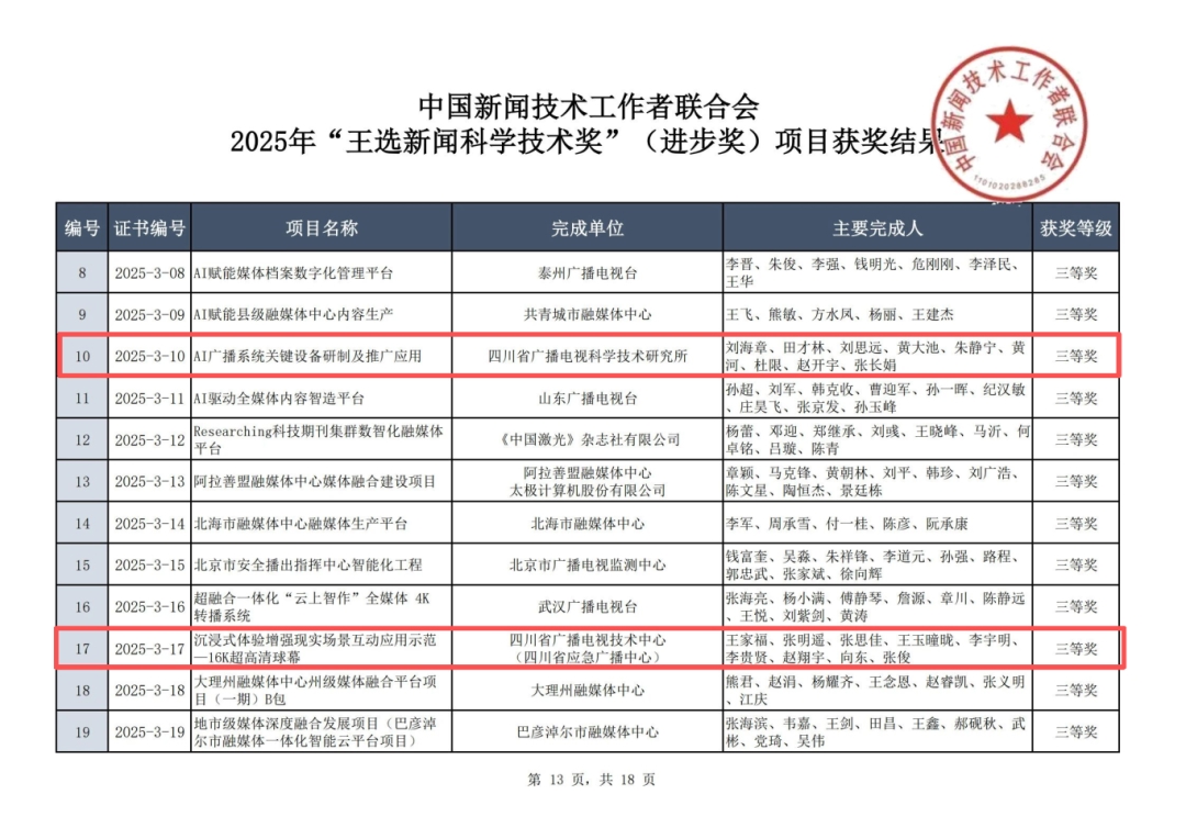 近日,2025年 “王选新闻科学技术奖” (项目奖)获奖名单正式揭晓。本次评选,来自四川的相关单位及项目成果表现突出,共斩获13个奖项。其中,一等奖6项、二等奖4项、三等奖3项,充分展现了四川在广电视听科学技术应用领域的强劲实力。