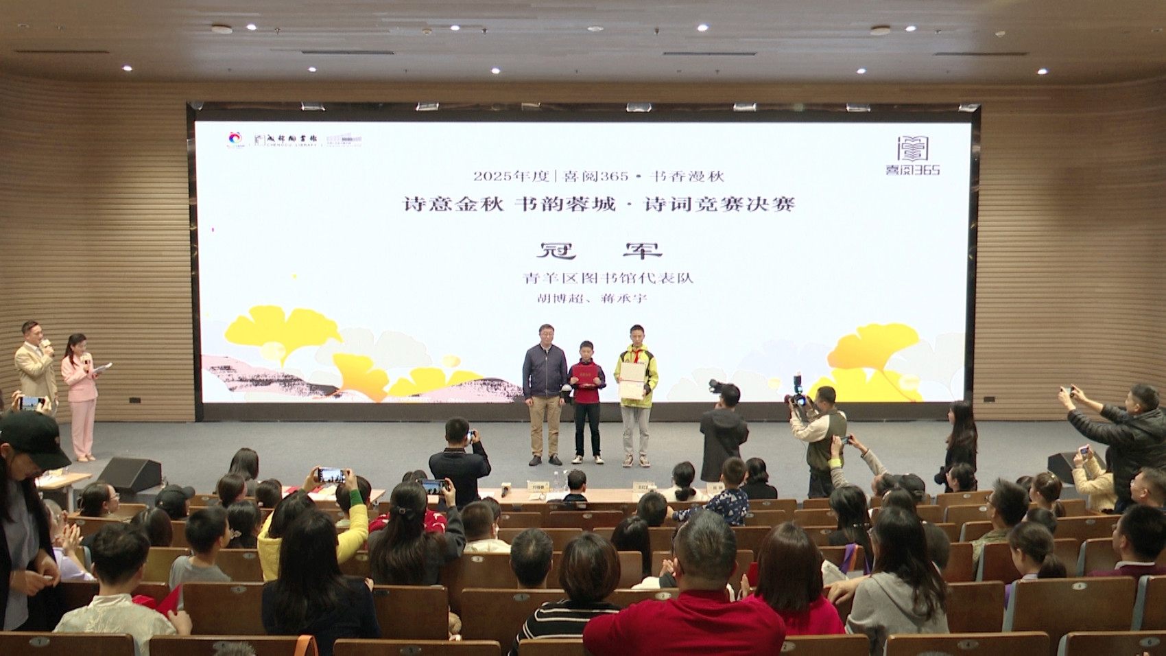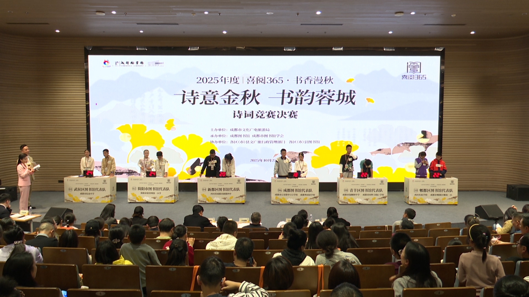 10月25日,2025年度“喜阅365・书香漫秋——诗意金秋,书韵蓉城”诗词竞赛决赛在成都天府人文艺术图书馆报告厅落下帷幕。11支青少年代表队经过多轮比赛脱颖而出,经过多轮角逐与专业评审,最终评选出冠亚季军各1组、优秀奖8组、诗词新秀奖11组。据统计,本次赛事自9月启动以来覆盖成都各区(市)县,累计吸引千余名7—15岁青少年参与。