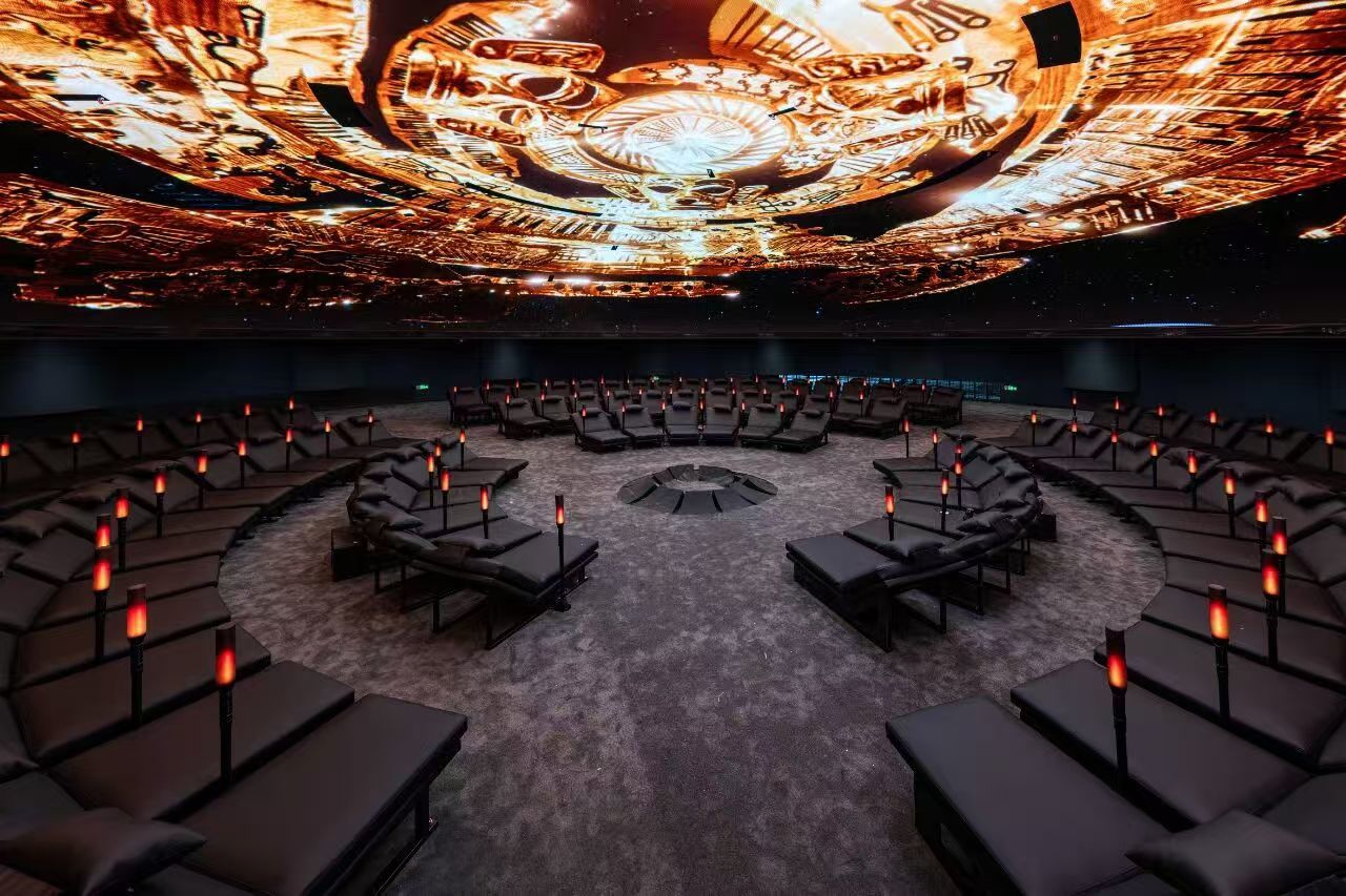 为提升体验质感,剧场融合多项前沿数字技术。在视听方面,拥有全国博物馆领域规模最大的交互式全景声LED穹顶,采用7468块LED模组搭建起直径为20米的穹顶,可实现近16K分辨率与近400平米的连续视觉场域,确保画面细节纤毫毕现;配备25路独立音响通道,构建完整的三维声场,实现声音与画面的精准同步,让神鸟掠过、风沙吹过、金器錾刻、玉石开凿、铜液滴落等音效极具临场感。108支数字火把在交互体验层面有了新突破,观众肢体动作可直接驱动场景动态变化,使其从被动“参观者”转变为主动“参与者”。