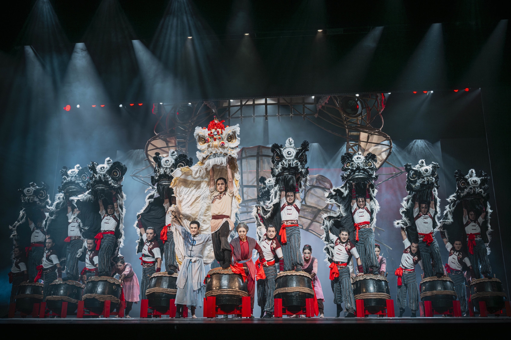 作为国内首部以“广东醒狮”为主题的原创舞剧,《醒・狮》融合南拳、木鱼歌、狮鼓、英歌等岭南传统元素,通过“采青”“扎狮头”等技艺的舞台化呈现,以及“饮茶叩指舞”“板凳舞”等创新舞蹈语汇,实现“舞”与“武”的交融。舞台上演员们腾挪闪扑、回旋飞跃,不仅展现出高超的技艺,更传递出中华儿女在危难时刻不屈不挠的精神气节。