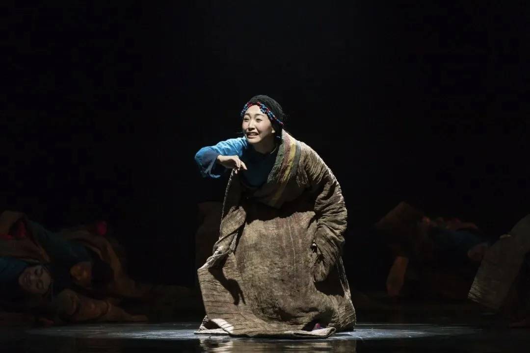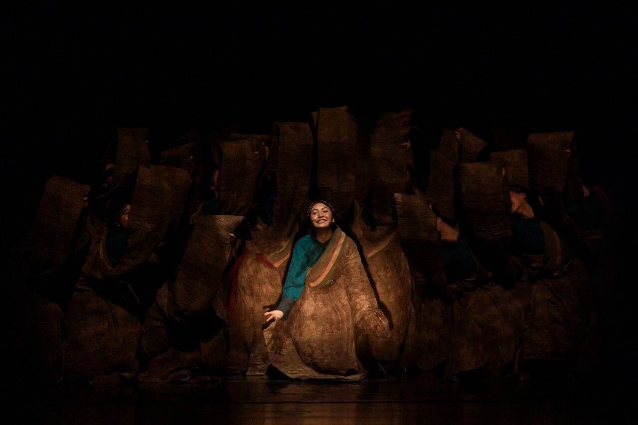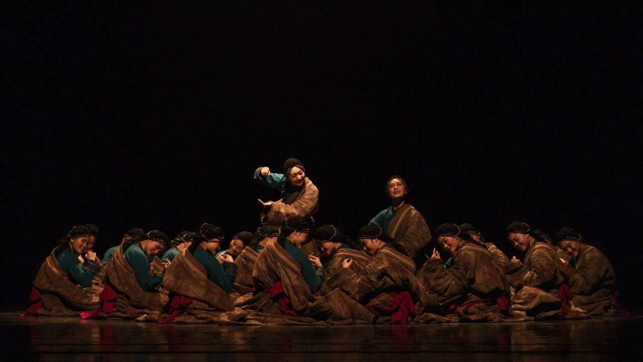 尤其令人动容的是,舞者将袖子搭肩的动作,既保留了藏族女性的温婉仪态,又暗含汉族文化中先生的庄重气质,在跨文化符号的融合中塑造出智慧、柔韧而有力的女性群像。舞台视觉设计同样充满哲思。灯光以暖色调为主,通过明暗变化,使舞台宛如一幅流动的油画。后半段舞者“见尘埃、见光、见所画之物”时的情感迸发,与前半段的静谧形成强烈对比,暗喻着文化传承中“守静”与“破茧”的辩证统一。