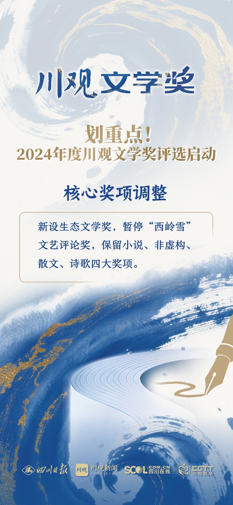 本届评选最大变化是新增生态文学奖,与小说奖、非虚构奖、散文奖、诗歌奖共同构成五大常态奖项,各奖项获奖作品不超过5篇(部)。新增奖项由四川日报社与四川省生态环境厅联合打造,聚焦小说、散文、诗歌体裁,鼓励作家深入书写人与自然的共生之道。原“西岭雪”文艺评论奖暂停评选,将视情况颁授特别荣誉奖和终身成就奖。
