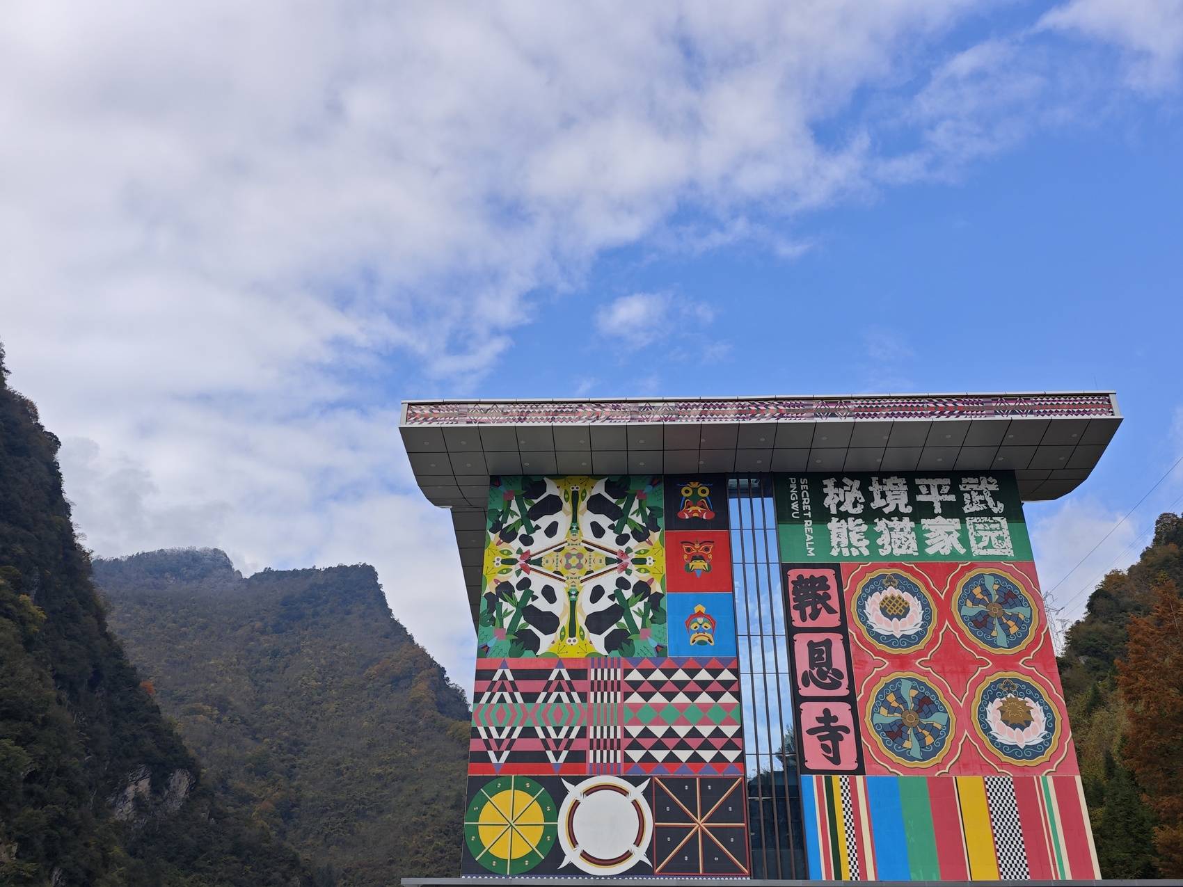经过木座服务区,不少车辆驶入休息。游客下车打卡服务区的标志性壁画,平武标志性景点报恩寺剪影穿插其中。憨态可掬的熊猫雕塑成了拍照点。