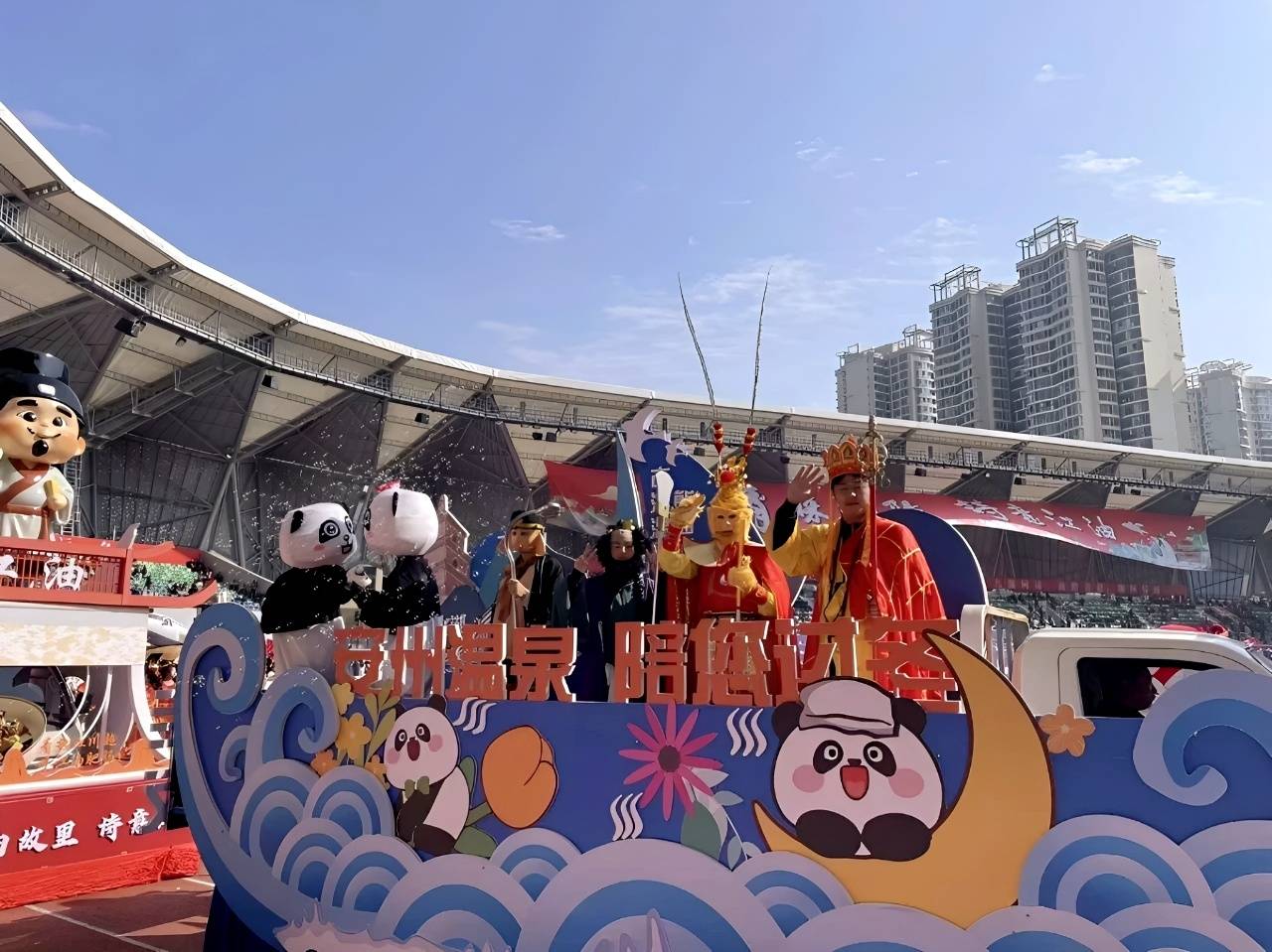 助威的人群,沸腾的欢呼,热闹的场面里还有让人会心一笑的彩蛋。唐僧手持禅杖示意,孙悟空耍着金箍棒高声助威,猪八戒与游客互动拍照,沙和尚扛着“绵阳必胜”横幅站定造势。来自绵阳安州罗浮山温泉旅游度假区,从电视剧集中跃出的《西游记》角色形象亮相,成为文旅IP向周边推广的代言人。