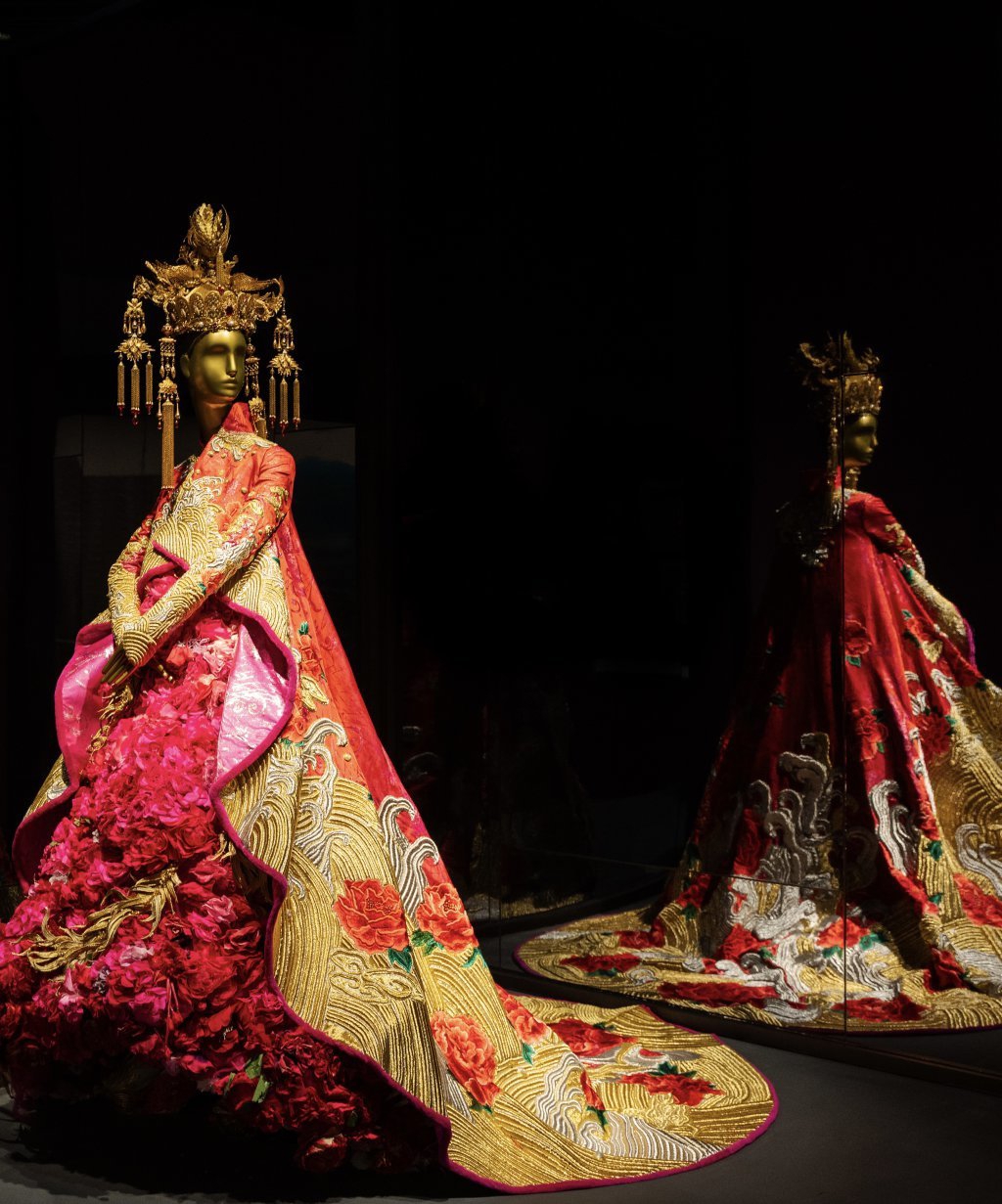 展览渐入尾声,郭培的“黄金嫁衣”将金线在当代服饰中的运用推至高潮。新娘装耗时五年,融合全球约30种刺绣技艺,在羊皮上进行立体垫绣,“双鱼”“牡丹”“葫芦”“龙凤”等传统吉祥图案宛如浮雕般呈现。新郎装则以龙纹为主体,衬以江崖海水纹样,气势磅礴。