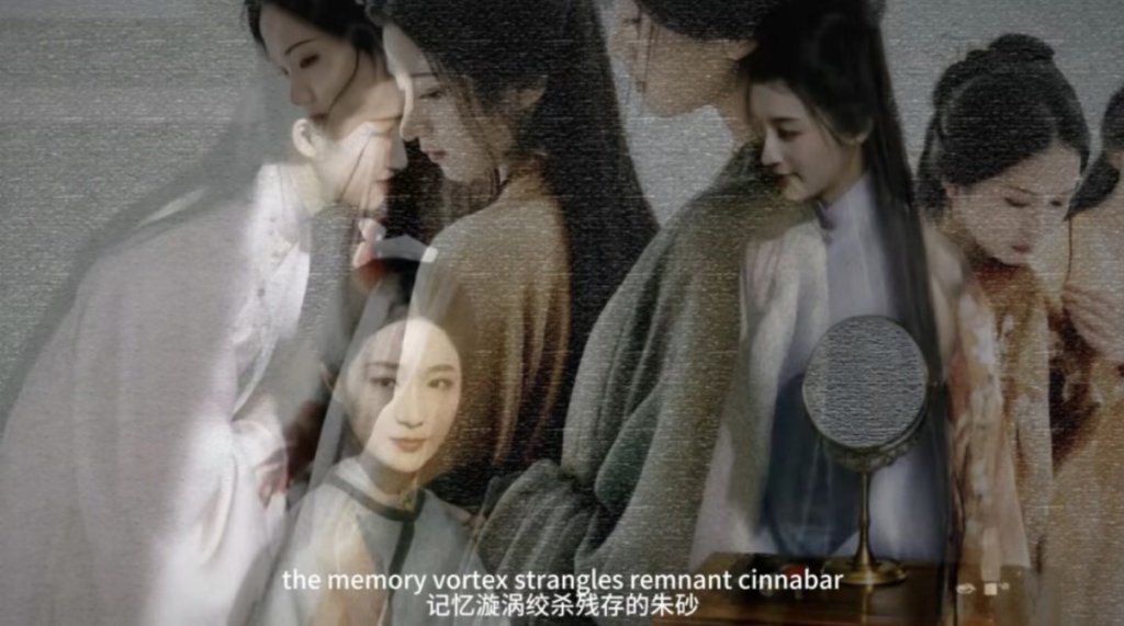 “浓雾/缠绕川泽/泥泞的魂魄失却了躯壳……”伴随着冷峻的旁白,一帧金碧山水迎面而来,拉开了AI视频作品《皮相经纬·渊艳志》的序幕。衣着华美、妆容精致的古代男女在不同场景中出现,漂亮却雷同,显得缺乏生命力。