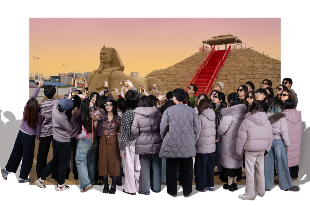在作品中,陈梦雪与众多“游客”一道出现在画面里,高举手机,摆出各种各样的造型,与泰姬陵、金字塔、凯旋门、比萨斜塔等世界著名景观合影留念。