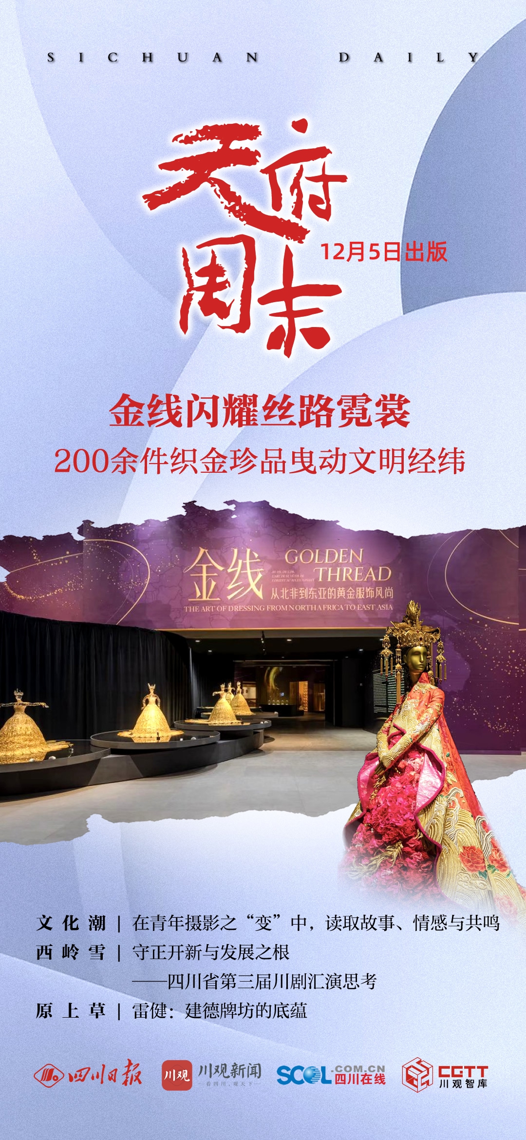 黄金,是宇宙给予人类的金色馈赠;丝绸,是古老中国对世界的珍贵献礼。当二者在古老的丝绸之路上相遇,一条文明经纬中的“金色纽带”,在千年古道间粲然铺展,在“千年丝路重镇”成都,迎来跨越山海的相聚。11月30日,“金线——从北非到东亚的黄金服饰风尚”特展在成都博物馆启幕。来自中法两国十余家文化机构与文博单位的200余件/套织金珍品,以金线为脉络,串联起从北非到东亚的服饰艺术史。本期封面,请跟记者走进特展,聆听金线背后文明交融的动人故事。