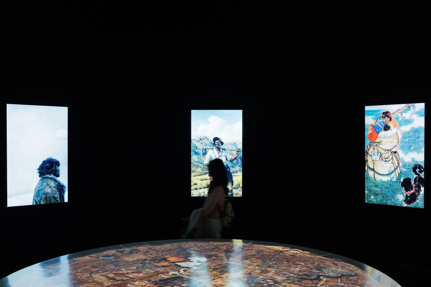 展览前段以数字重建、三维扫描与虚实结合的影像语言,呈现西藏和平解放、铁路建设等重大历史场景,并将董希文、韩书力、李焕民、吴冠中等艺术家的经典之作转化为可行走的动态长卷。悬挂于空间的氆氇结构时而舒展、时而收拢,象征时间流转与文化延续。观众可在光影流动间,在历史影像与艺术表达的交织中回望时代进程。