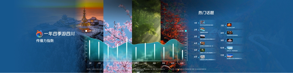 同步发布的“一年四季游四川”传播力指数显示,文旅宣传力度、网络热度与游客接待量呈显著正相关。在系列主题推广带动下,四川已形成“四季皆可游”的全域全时旅游形象,春季花海、夏季清凉、秋季彩林、冬季冰雪等季节性产品持续走热,节假日及暑期游客量稳步增长。随着冬游四川活动启动,预计将迎来新一轮文旅消费热潮。