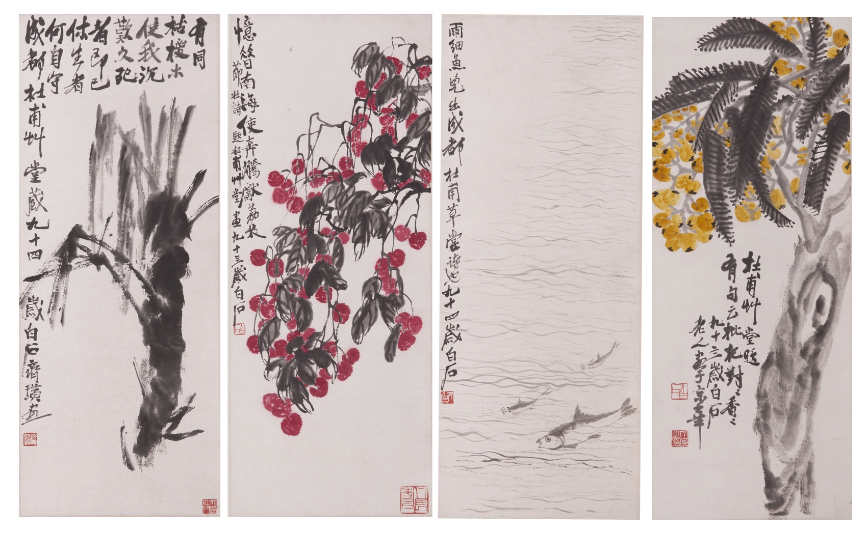 这样的“重合”在展览中处处可见。九十一岁的齐白石接到草堂邀请,以杜甫诗意创作四条屏。在构思《枯棕》时,他彻夜难眠。“蜀门多棕榈,高者十八九。其皮割剥甚,虽众亦易朽。”杜甫笔下,那株虽枯未死的棕树,正是历经沧桑的百姓写照。千余载之后,白石老人以雄健笔墨,与杜甫遥相呼应。这是一次“今日之我”与“昔日之你”的灵魂共振。