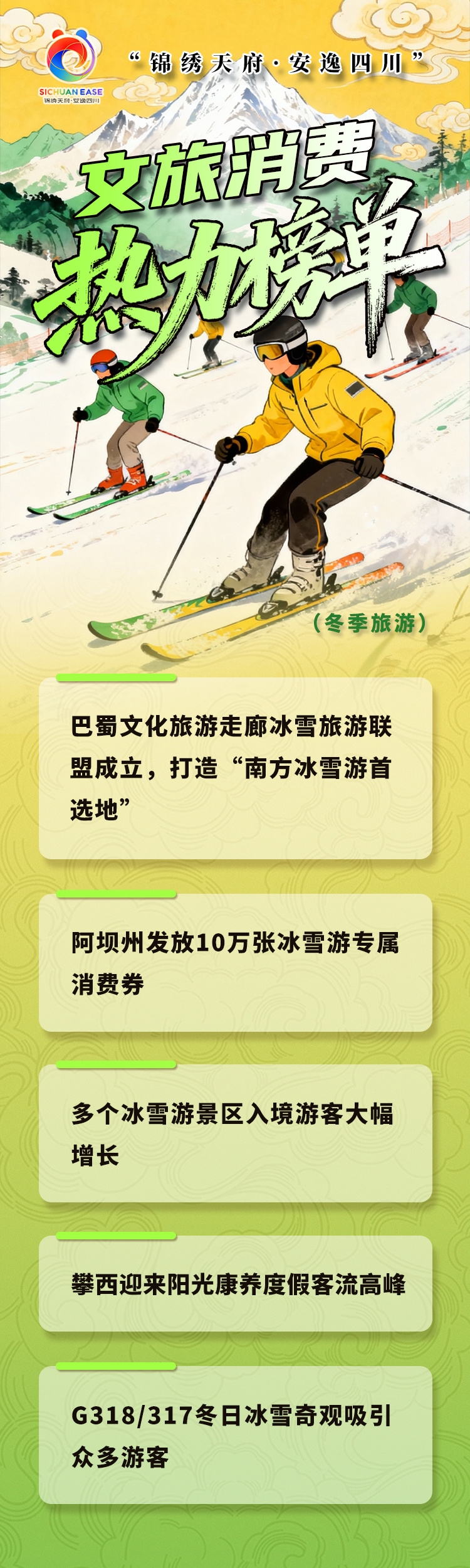 据悉,此次发布的三大热力榜单,基于消费热度、用户口碑、创新指数、带动效应等多维度进行综合分析,呈现文旅消费新特点、新趋势。其中,双节大假消费榜单重点展现新消费模式爆发式增长态势,凸显“文旅+交通”“文旅+商业”的融合赋能成效;演艺赛事消费榜单聚焦精品演出、体育赛事等沉浸式体验项目,反映了年轻群体对高品质、个性化文旅产品的旺盛需求;冬季旅游消费榜单则围绕滑雪、温泉、暖阳等四川特色产品,彰显四川冬季文旅市场的独特资源优势与潜力空间。