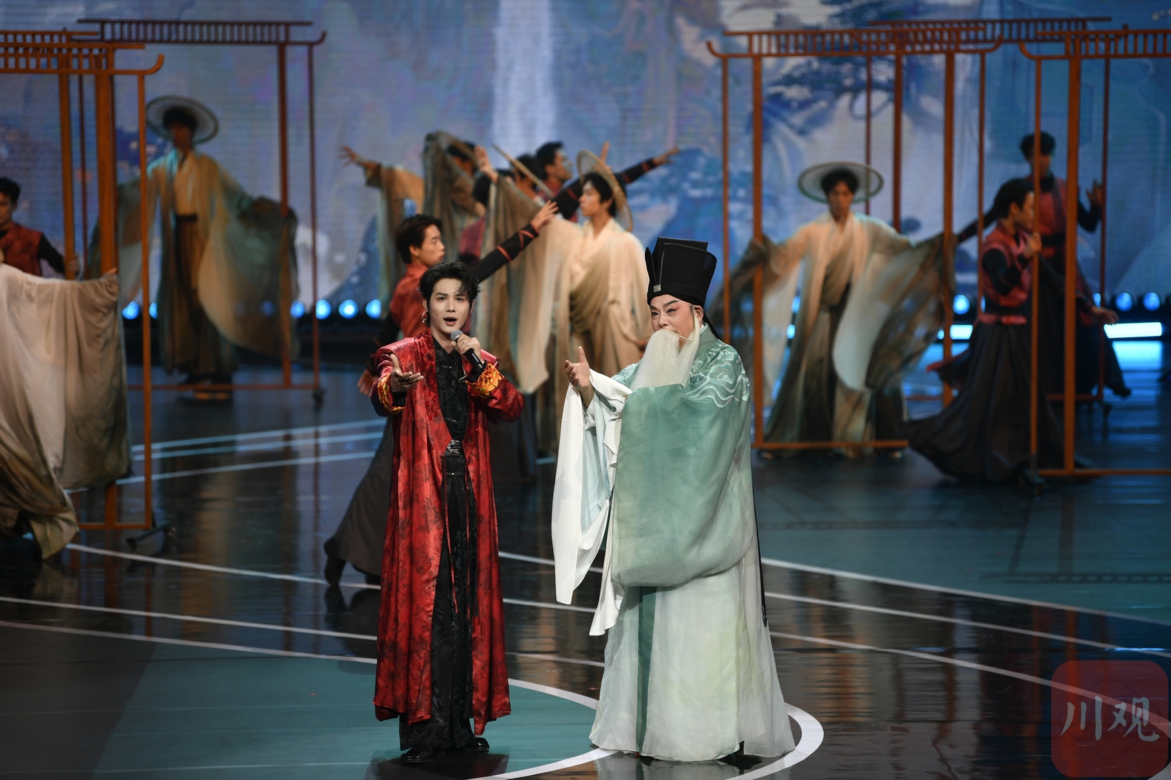 杜甫、苏轼等蜀地知名文化大家的故事,也相继登上舞台。知名中阮演奏家冯满天携诗乐吟诵《蜀道难》,引领观众与唐代“诗圣”杜甫进行精神对话,展现其诗歌跨越千年的生命力。四川省文联主席、四川省川剧院院长陈智林与青年演员郑业成合作,带来川剧新编节目,将第十八届文华剧目奖获奖剧目《梦回东坡》与流行歌曲相融合。