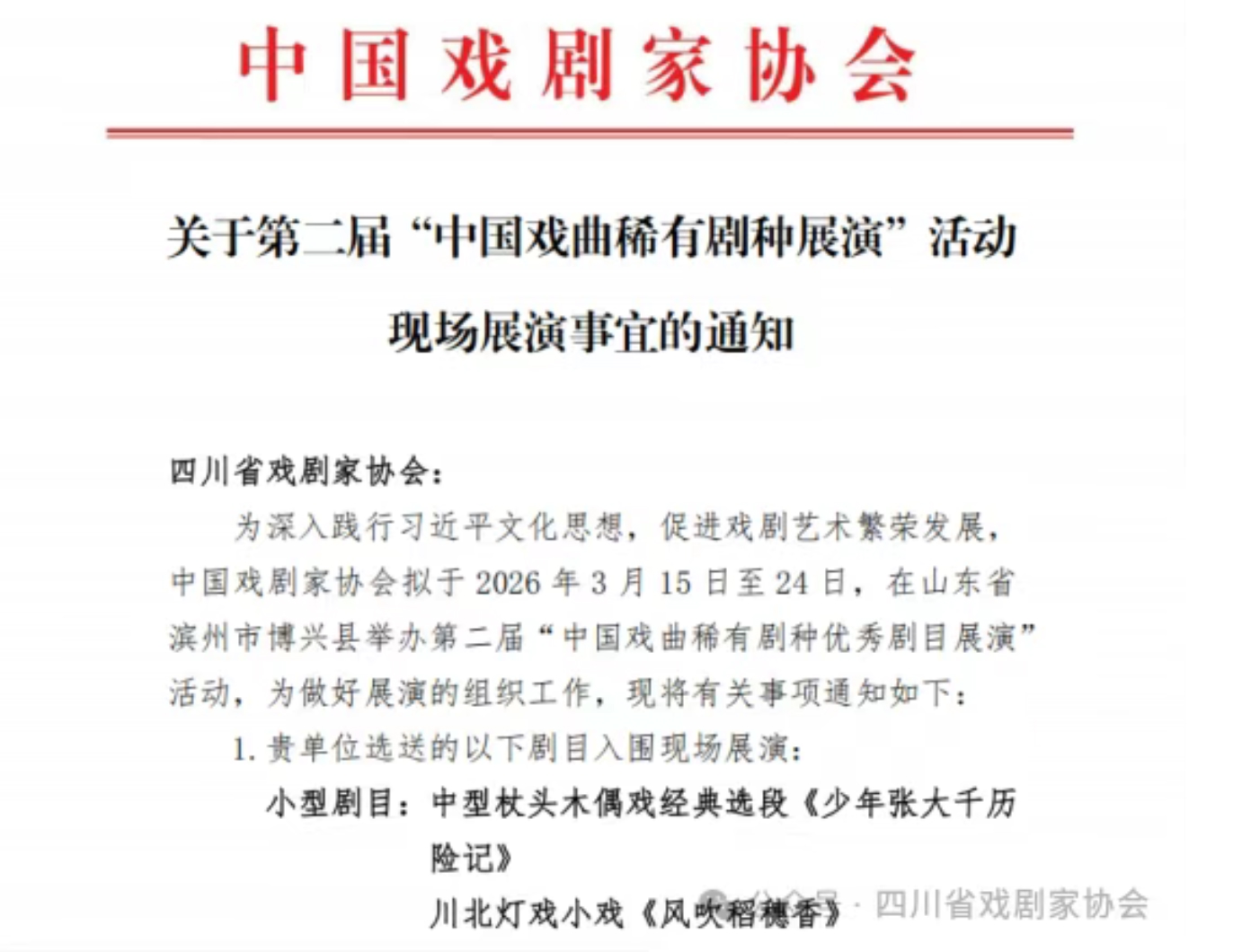 近日,中国戏剧家协会发布《关于第二届“中国戏曲稀有剧种展演”活动现场展演事宜的通知》。由四川省戏剧家协会选推的2部小型剧目中型杖头木偶戏经典选段《少年张大千历险记》(资中县木偶剧团)、川北灯戏小戏《风吹稻穗香》(南充市川剧团〔川北灯戏剧团〕)入选这一“国字号”展演。