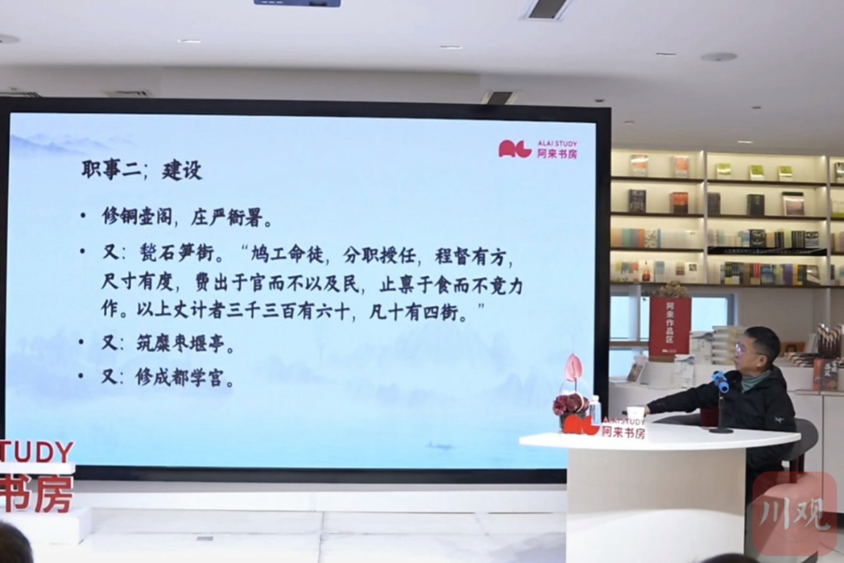 开讲前,阿来聊了聊他的新作《东坡在人间》,“我们总爱把苏东坡神化,津津乐道他的豁达与美食,却忘了他首先是个实打实的行动者。在中央任礼部、兵部尚书这样的二品大员,在地方当知州理政,立言、立功、立德样样不曾缺位。我们该放下仰望,以平视视角做他的朋友。”而这份“务实为要”的认知,也成为阿来解读范成大治蜀生涯的核心脉络。