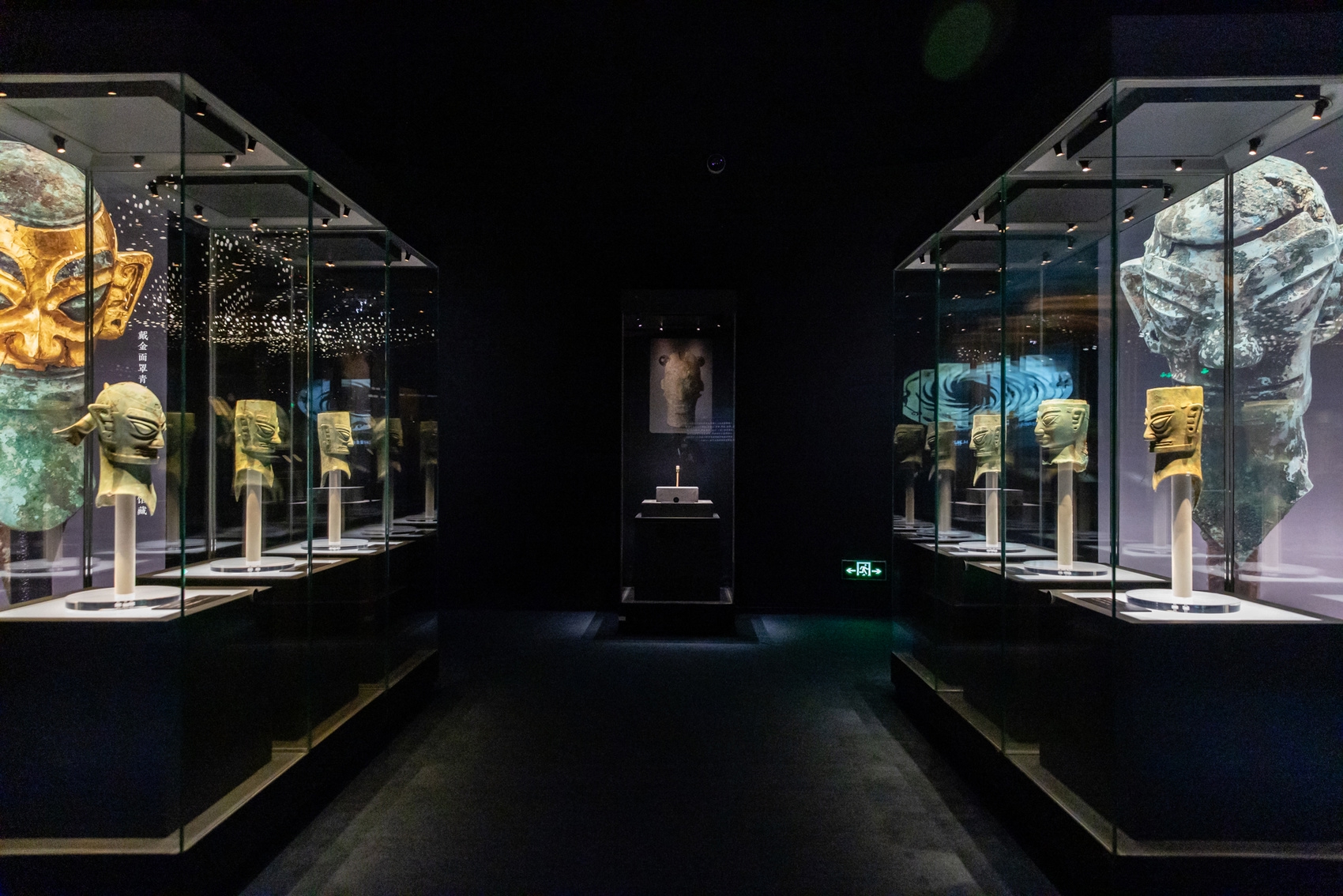观众拍摄戴金面罩青铜人头像