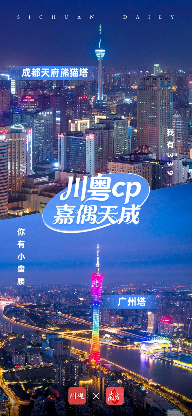 即日起,四川日报、川观新闻联动南方日报、南方+发起“川粤CP嘉偶天成——成都广州双城地标情感记忆征集令”,邀你一起,来一场跨越千里的双向奔赴!在微博平台、微信视频号、抖音平台,带任意话题#川粤CP嘉偶天成##嘉个好友成你好事#,分享你与两地城市地标的动人故事。