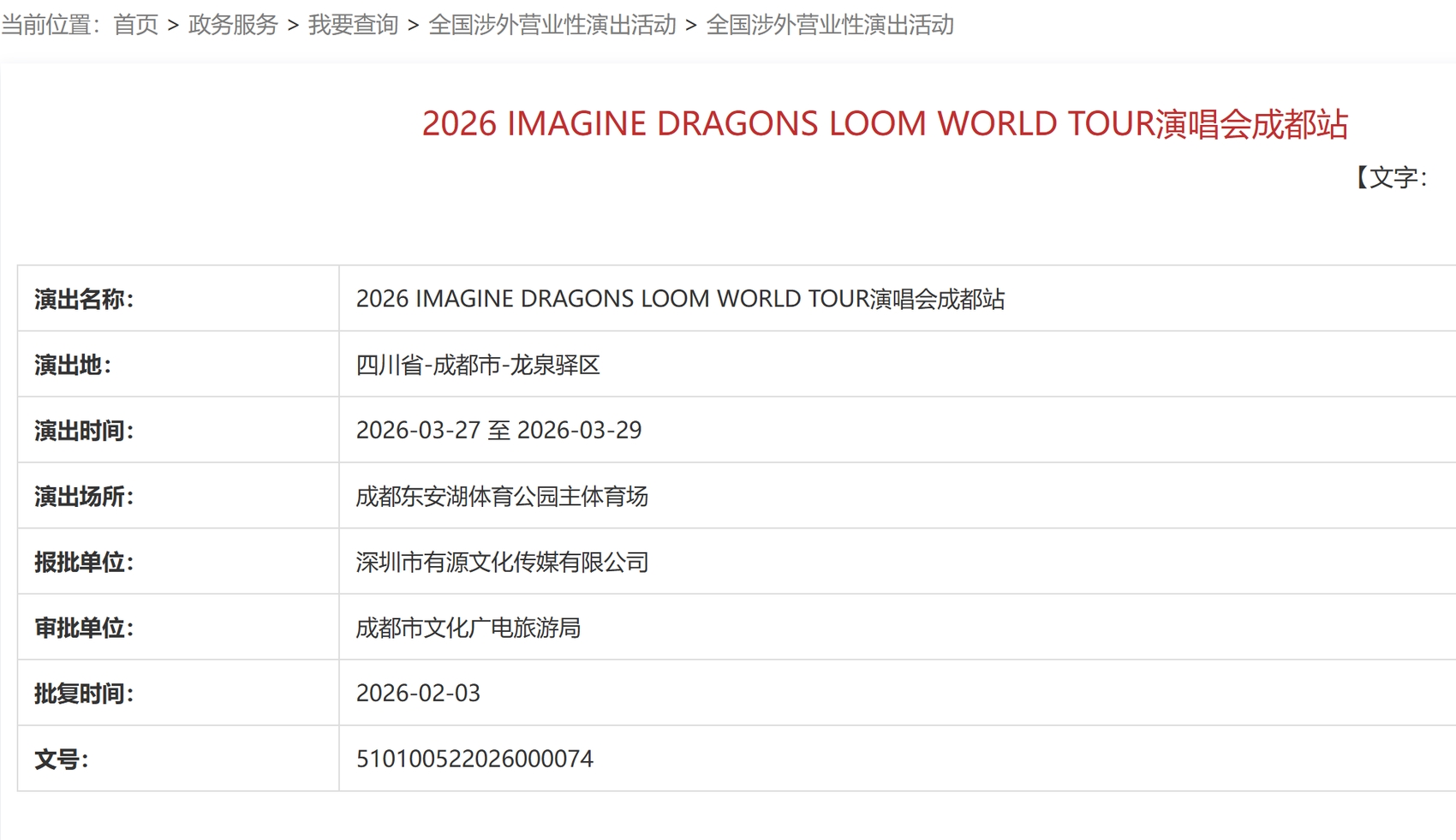 2月4日,记者从文化和旅游部官网获悉,知名摇滚乐队梦龙乐队(IMAGINE DRAGONS)成都站演唱会已经获批,将于3月27日至29日在成都东安湖体育公园主体育场开唱。