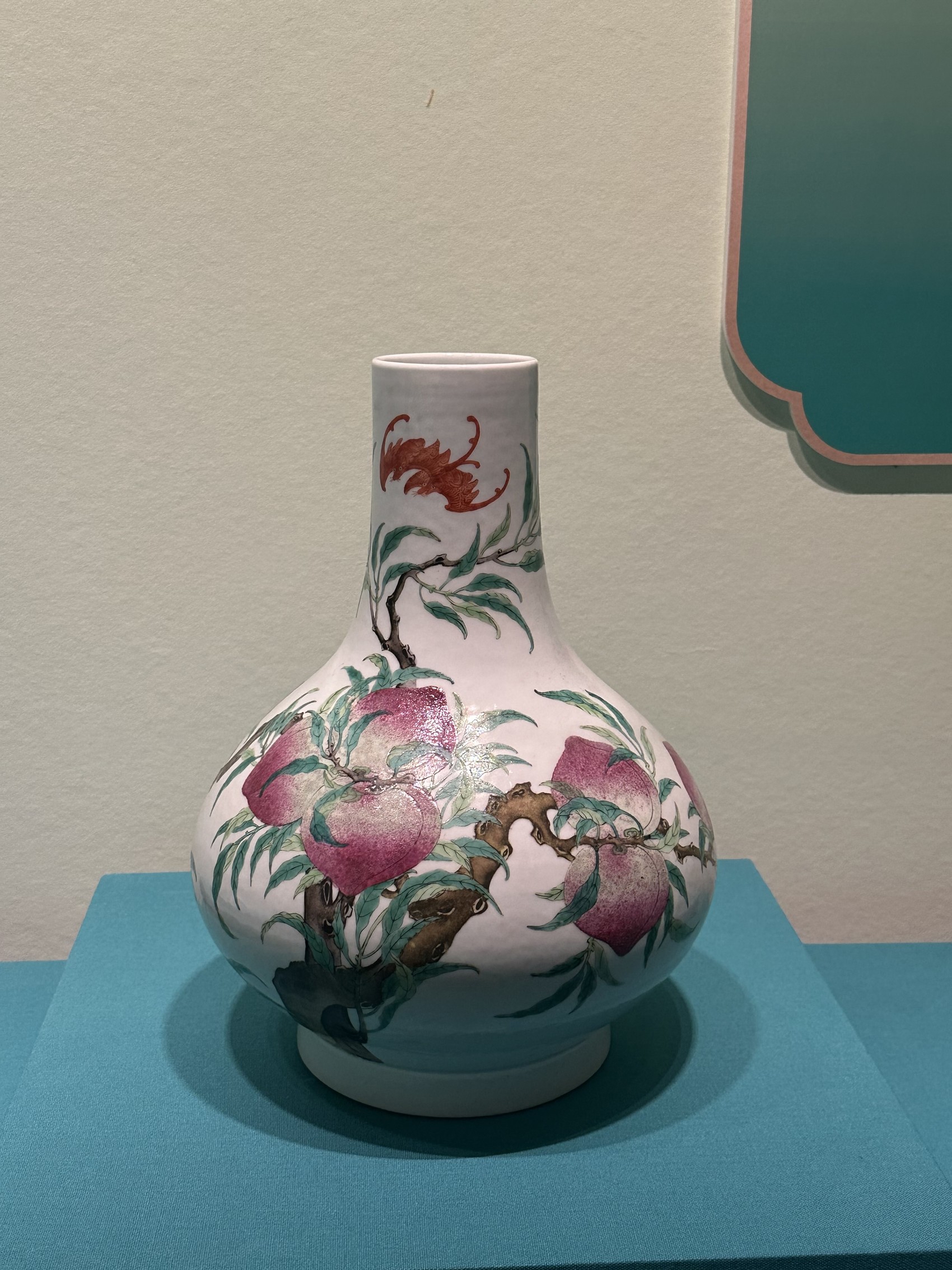 此次展览以吉祥文化为魂,通过序章“福泽绵长”与“寓吉于器”“纳祥于艺”“蕴祥于礼”3个主体单元,以及尾章“山海同春”,层层递进,构建完整的叙事体系。在展览上,汉代“大吉羊”云纹瓦当的古朴厚重、唐代海兽葡萄纹铜镜的精美繁复,直观印证吉祥观念贯穿中华文明的发展脉络;清代粉彩花卉五蝠捧寿瓷碟、清代粉彩九桃纹瓷天球瓶等展品,展示了古代如何将动植物纹饰赋予福、禄、寿等美好寓意;清代《群仙祝寿图》轴、清代通草水彩婚俗图、清代元宵花灯巡游通草画等文物,不仅展现礼仪之邦的深厚传统,更揭示吉祥文化从个人祝愿升华为民族共同情感纽带的演变过程。